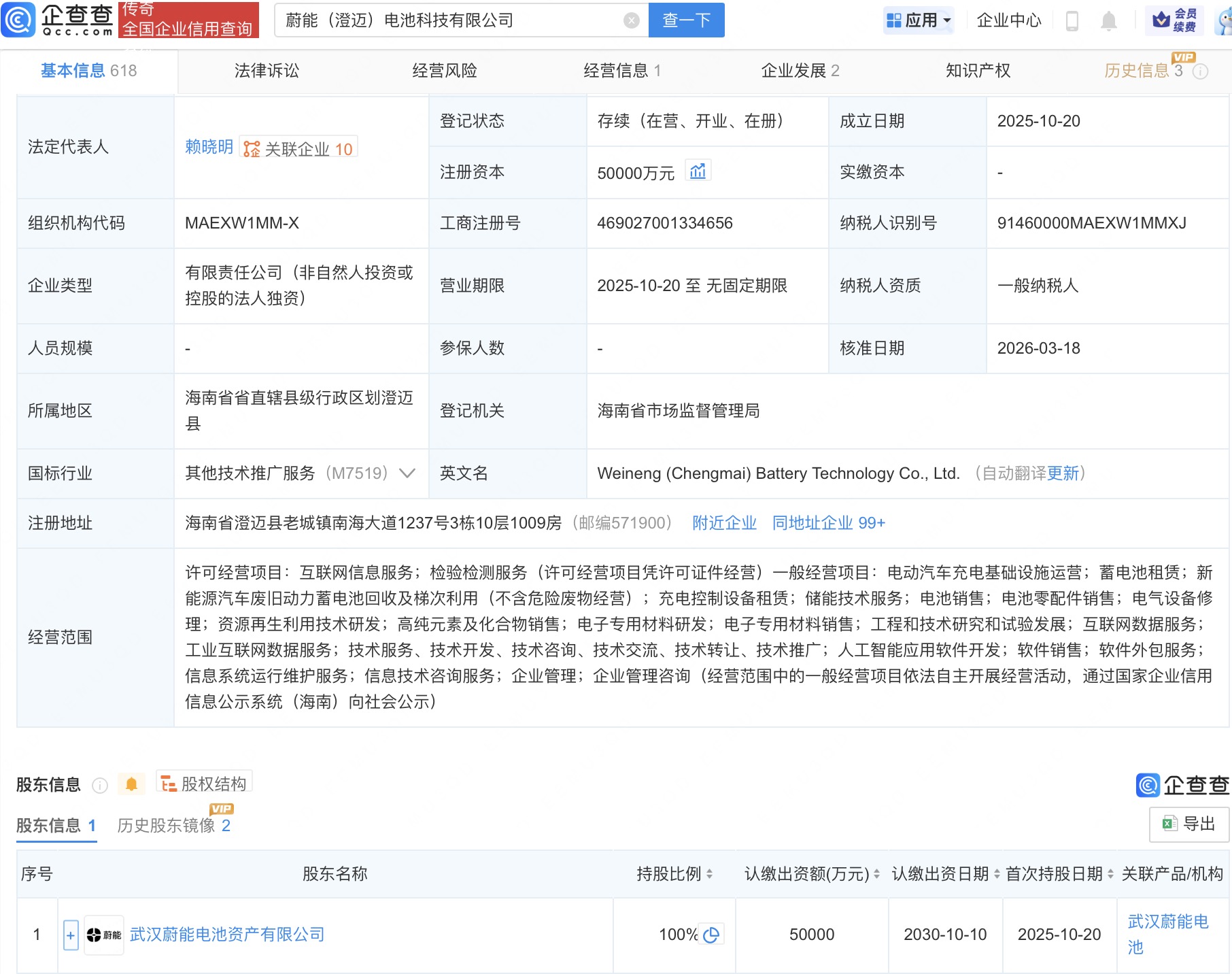 企查查APP显示,近日,蔚能(澄迈)电池科技有限公司发生工商变更,注册资本由6000万元增至5亿元,增幅约733%。企查查信息显示,该公司成立于2025年,经营范围包括电动汽车充电基础设施运营、蓄电池租赁、新能源汽车废旧动力蓄电池回收及梯次利用等,由武汉蔚能电池资产有限公司全资持股。