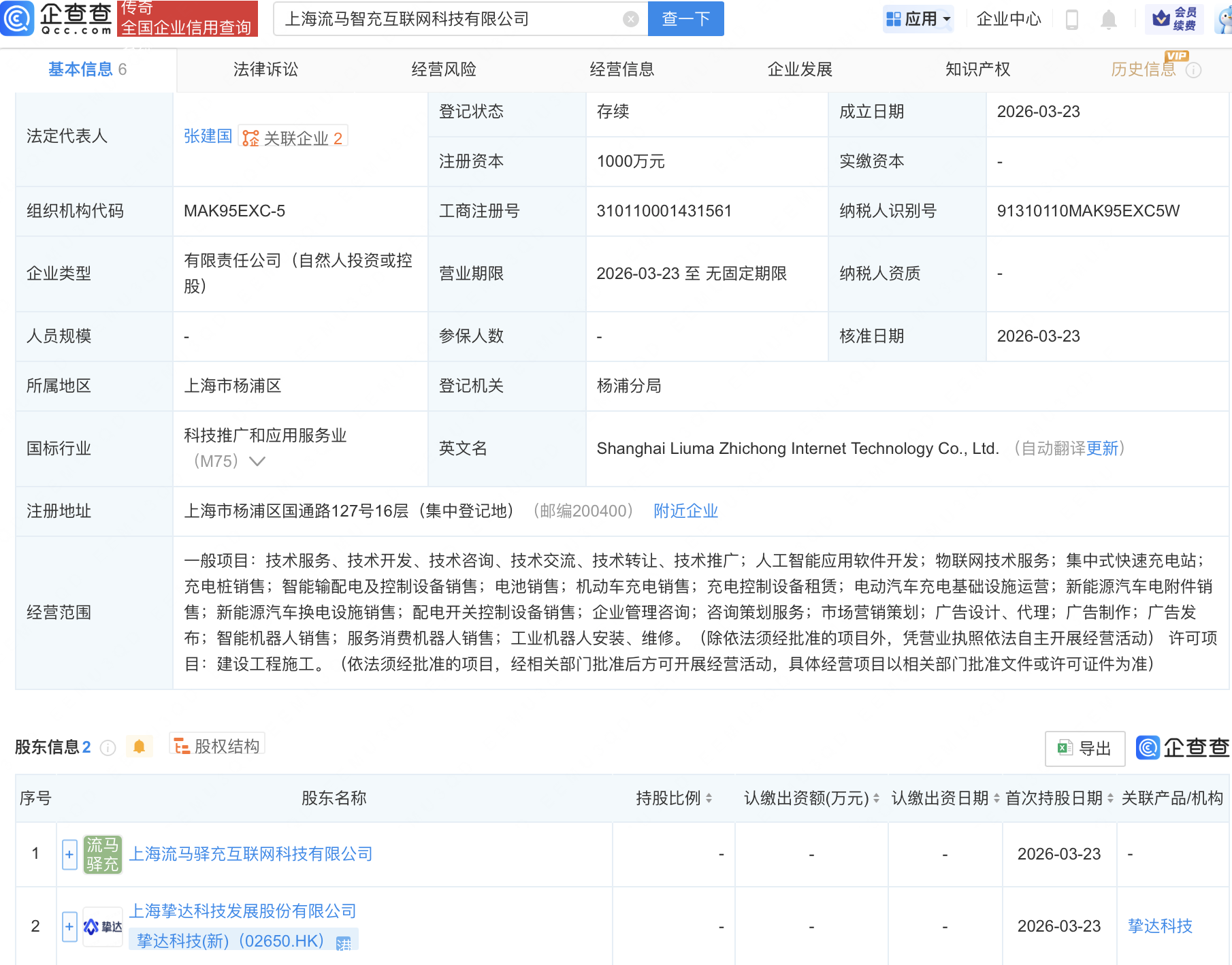 企查查APP显示,近日,上海流马智充互联网科技有限公司成立,注册资本1000万元,经营范围包含:人工智能应用软件开发;物联网技术服务;电动汽车充电基础设施运营;智能机器人销售等。企查查股权穿透显示,该公司由挚达科技(新)(02650.HK)等共同持股。