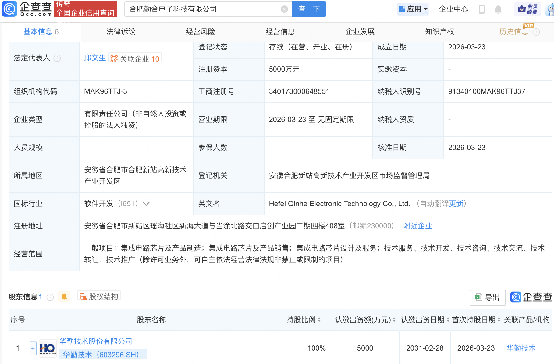 企查查APP显示,近日,合肥勤合电子科技有限公司成立,注册资本5000万元,经营范围包含:集成电路芯片及产品制造;集成电路芯片及产品销售;集成电路芯片设计及服务等。企查查股权穿透显示,该公司由华勤技术(603296)全资持股。