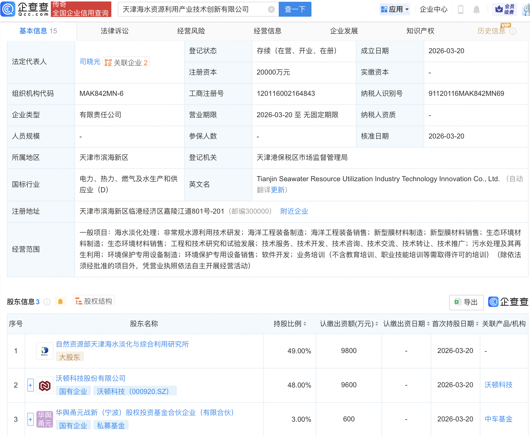 企查查APP显示,近日,天津海水资源利用产业技术创新有限公司成立,注册资本2亿元,经营范围包含:海水淡化处理;非常规水源利用技术研发;海洋工程装备制造;海洋工程装备销售等。企查查股权穿透显示,该公司由沃顿科技(000920)等共同持股。