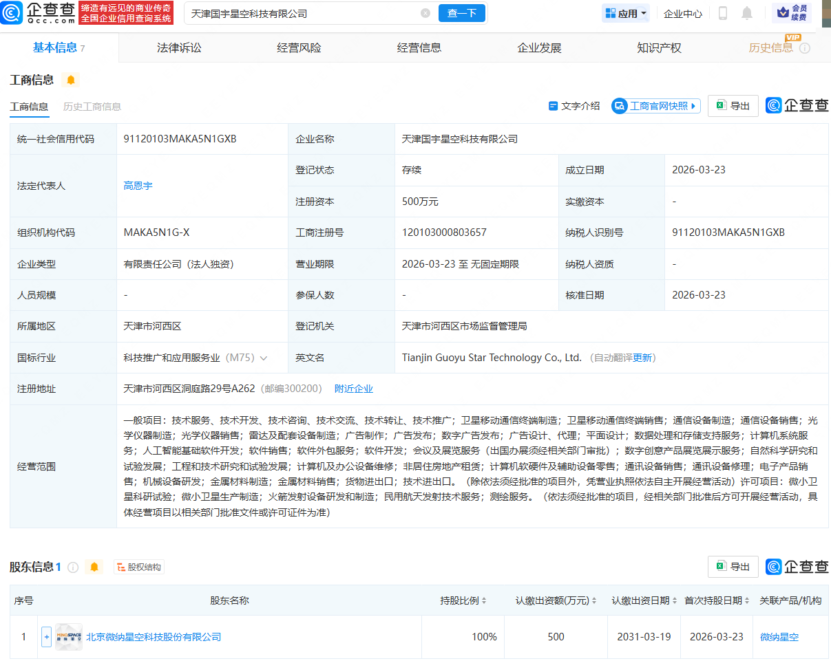 企查查APP显示,近日,天津国宇星空科技有限公司成立,法定代表人为高恩宇,注经营范围包含:卫星移动通信终端制造;通信设备制造;光学仪器制造;火箭发射设备研发和制造;民用航天发射技术服务等。企查查股权穿透显示,该公司由北京微纳星空科技股份有限公司全资持股。