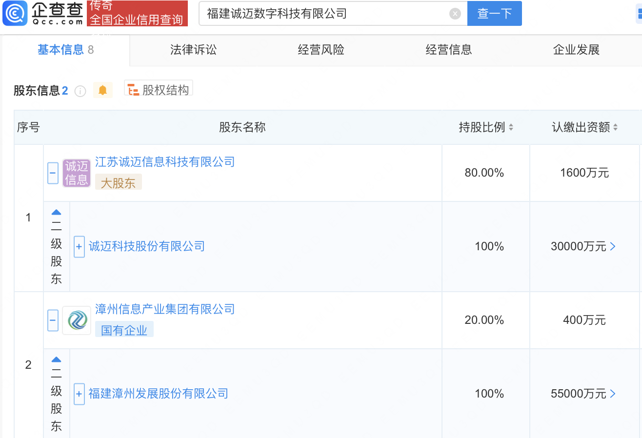 企查查APP显示,近日,福建诚迈数字科技有限公司成立,注册资本2000万元,经营范围包含:网络与信息安全软件开发;互联网安全服务;集成电路设计;集成电路销售等。企查查股权穿透显示,该公司由诚迈科技(300598)、漳州发展(000753)间接共同持股。