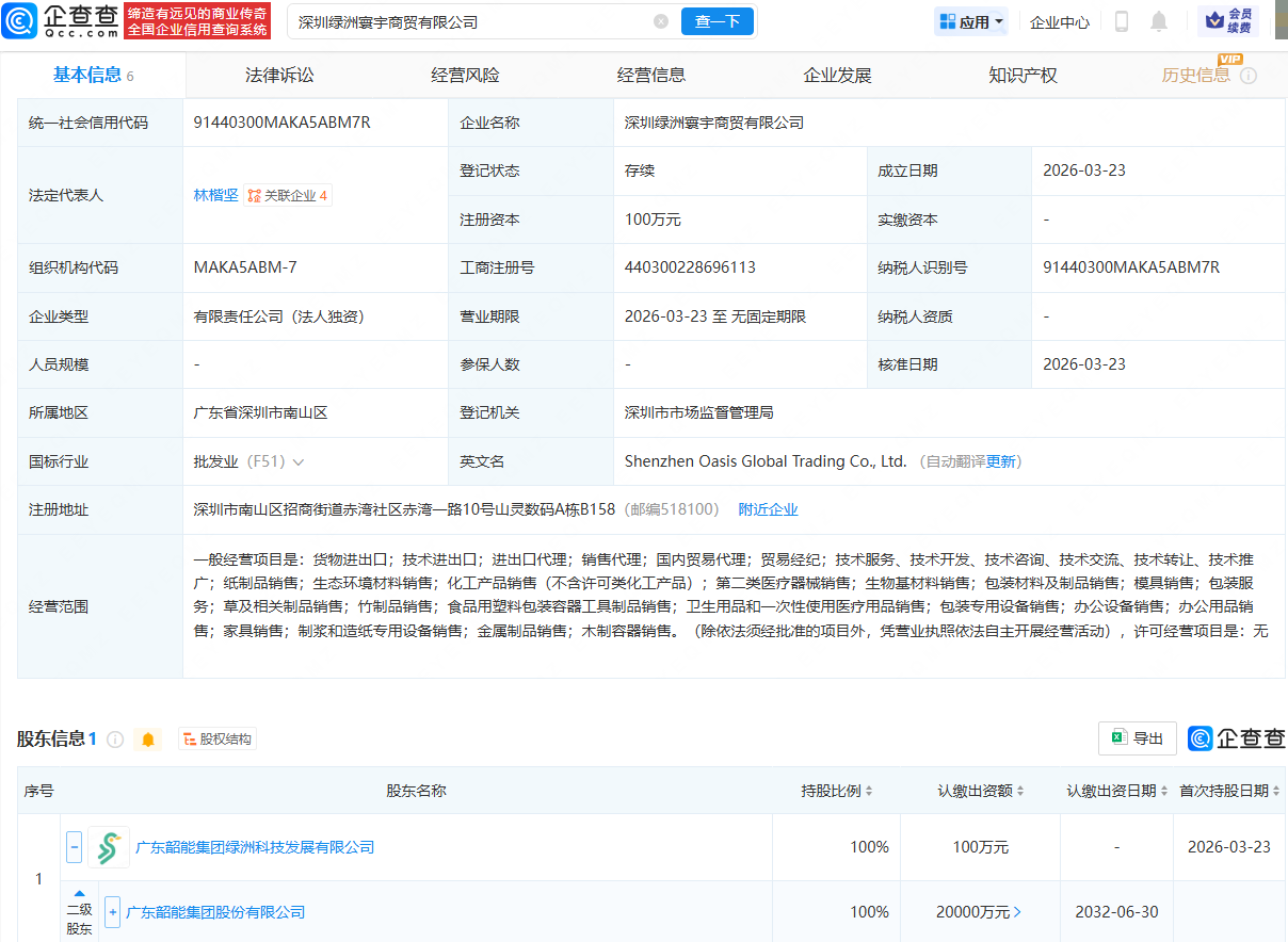 企查查APP显示,近日,深圳绿洲寰宇商贸有限公司成立,法定代表人为林楷坚,经营范围包含:货物进出口;技术进出口;进出口代理;纸制品销售;生态环境材料销售;生物基材料销售等。企查查股权穿透显示,该公司由韶能股份(000601)间接全资持股。