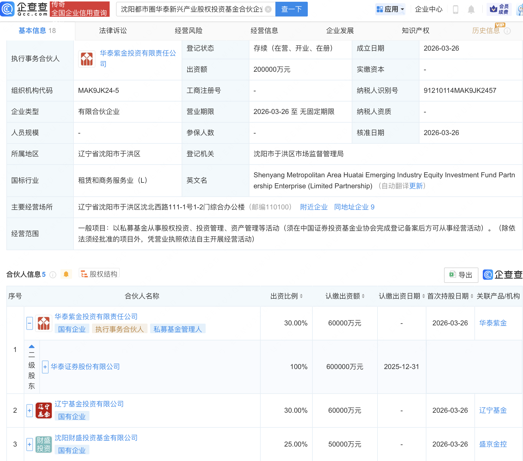 企查查APP显示,近日,沈阳都市圈华泰新兴产业股权投资基金合伙企业(有限合伙)成立,出资额20亿元,经营范围包含:以私募基金从事股权投资、投资管理、资产管理等活动。企查查股权穿透显示,该企业由华泰证券(601688)全资子公司华泰紫金投资有限责任公司、辽宁基金投资有限公司等共同出资。