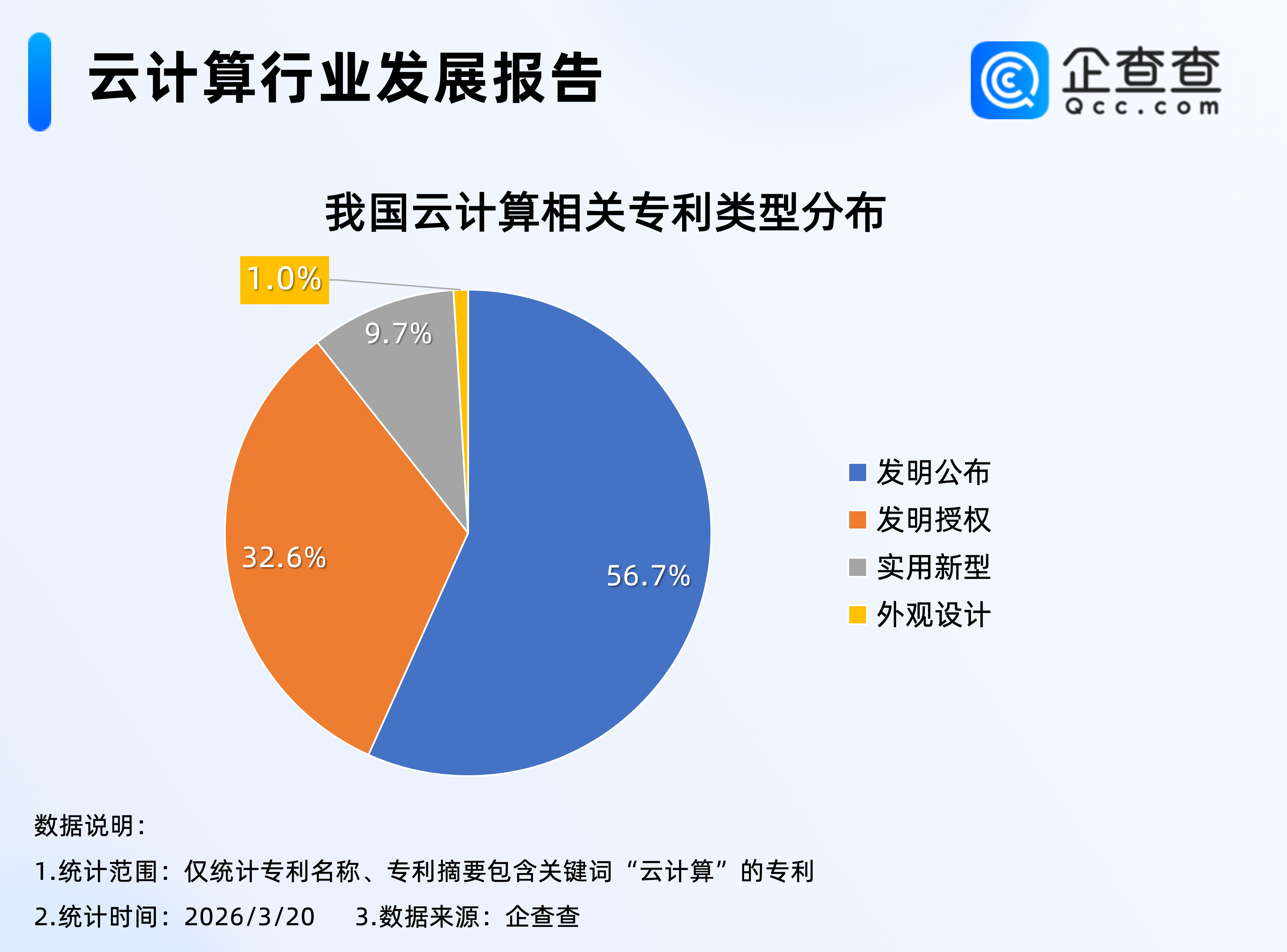 企查查数据显示,截至3月20日,我国现有2.9万项云计算相关专利,其中,2025年全年云计算相关专利申请量达2369项。专利类型上,发明专利最多,其中,发明公布占比56.7%,发明授权占比32.6%。