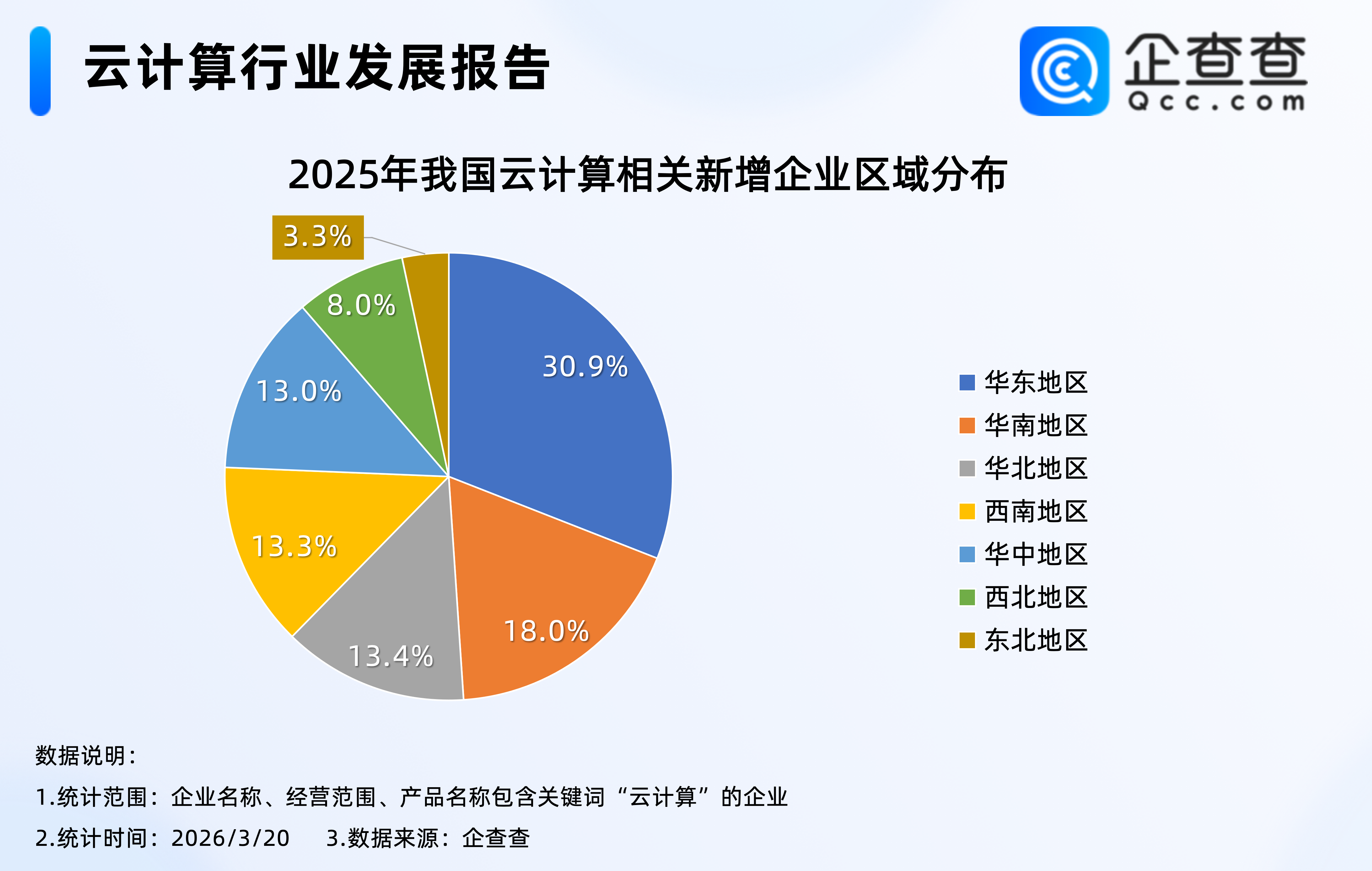 企查查数据显示,2025年新注册的17万家云计算相关企业中,超三成位于华东地区,其次是华南、华北地区,分占18.0%、13.4%;东北地区云计算相关企业相对较少,占比3.3%。