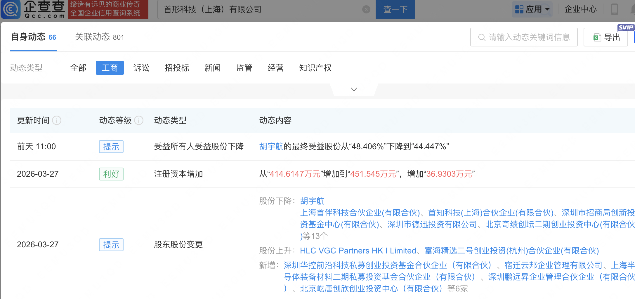 企查查APP显示,近日,首形科技(上海)有限公司发生工商变更,新增京东关联公司宿迁云邦企业管理有限公司等为股东,同时注册资本增至451.545万元。企查查信息显示,该公司成立于2024年,经营范围包含:智能机器人的研发;人工智能基础软件开发;人工智能应用软件开发等。公开信息显示,首形科技是一家超仿生仿人机器人研发商。