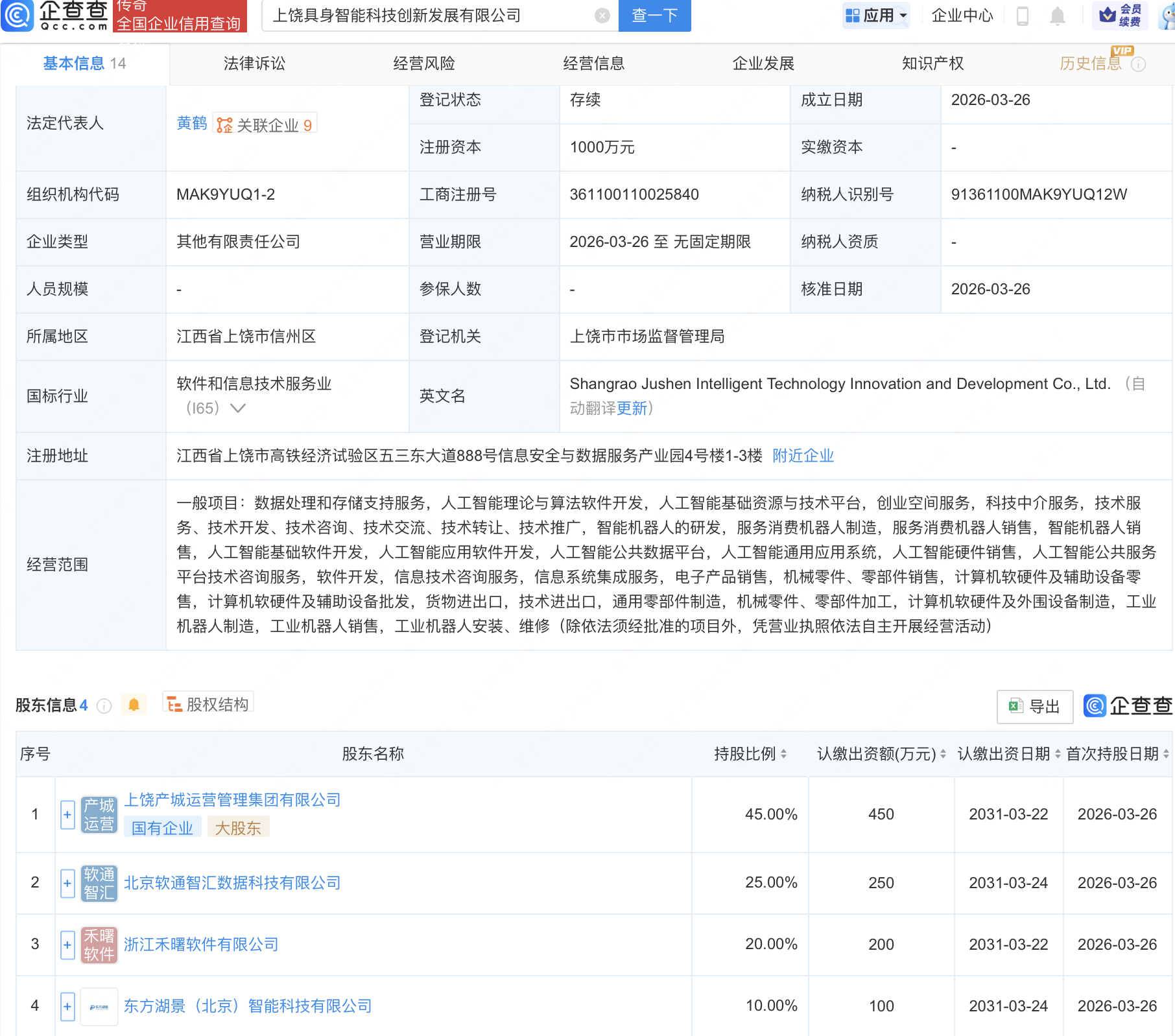 企查查APP显示,近日,上饶具身智能科技创新发展有限公司成立,经营范围包含:人工智能理论与算法软件开发,人工智能基础资源与技术平台,智能机器人的研发,服务消费机器人制造等。企查查股权穿透显示,该公司由上饶产城运营管理集团有限公司等共同持股。