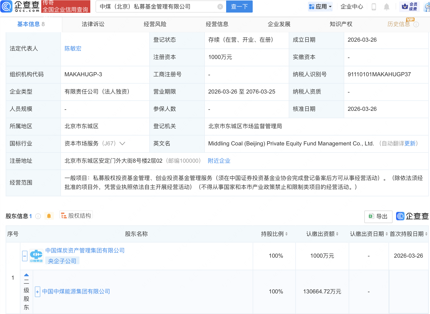 企查查APP显示,近日,中煤(北京)私募基金管理有限公司成立,注册资本1000万元,经营范围包含:私募股权投资基金管理、创业投资基金管理服务。企查查股权穿透显示,该公司由中国中煤能源集团有限公司间接全资持股。