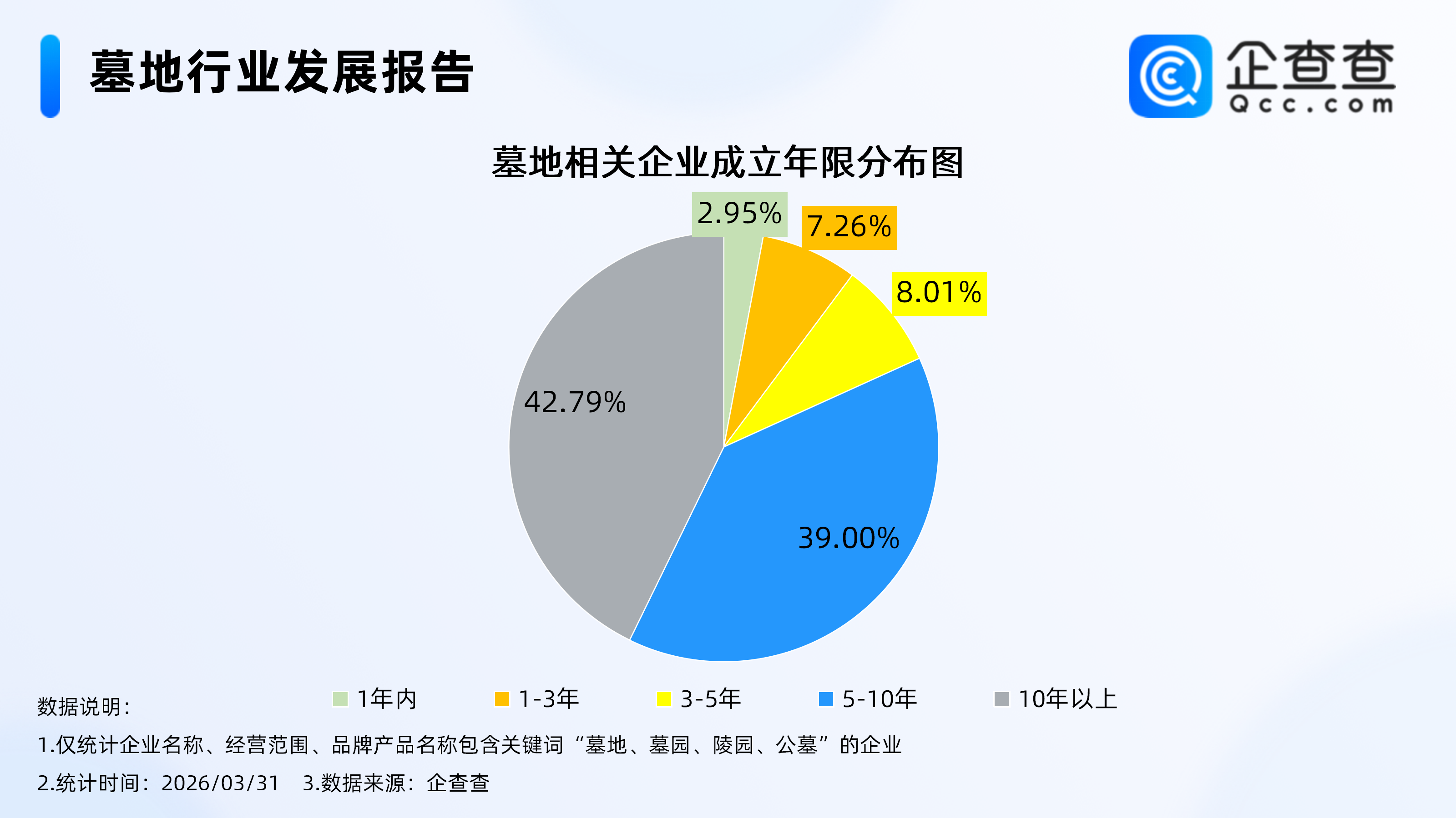 企查查数据显示,截至3月底,国内现存墓地相关企业1.1万家。注册量方面,自2019年起墓地相关企业年度注册量开始下滑,2025年全年注册339家墓地相关企业,截至目前,今年仅注册42家。从经营时间来看,现存的墓地相关企业多为成熟企业,成立年限在5年以上的企业超八成,成立10年以上的最多,占42.79%,成立5-10年的企业占39%。