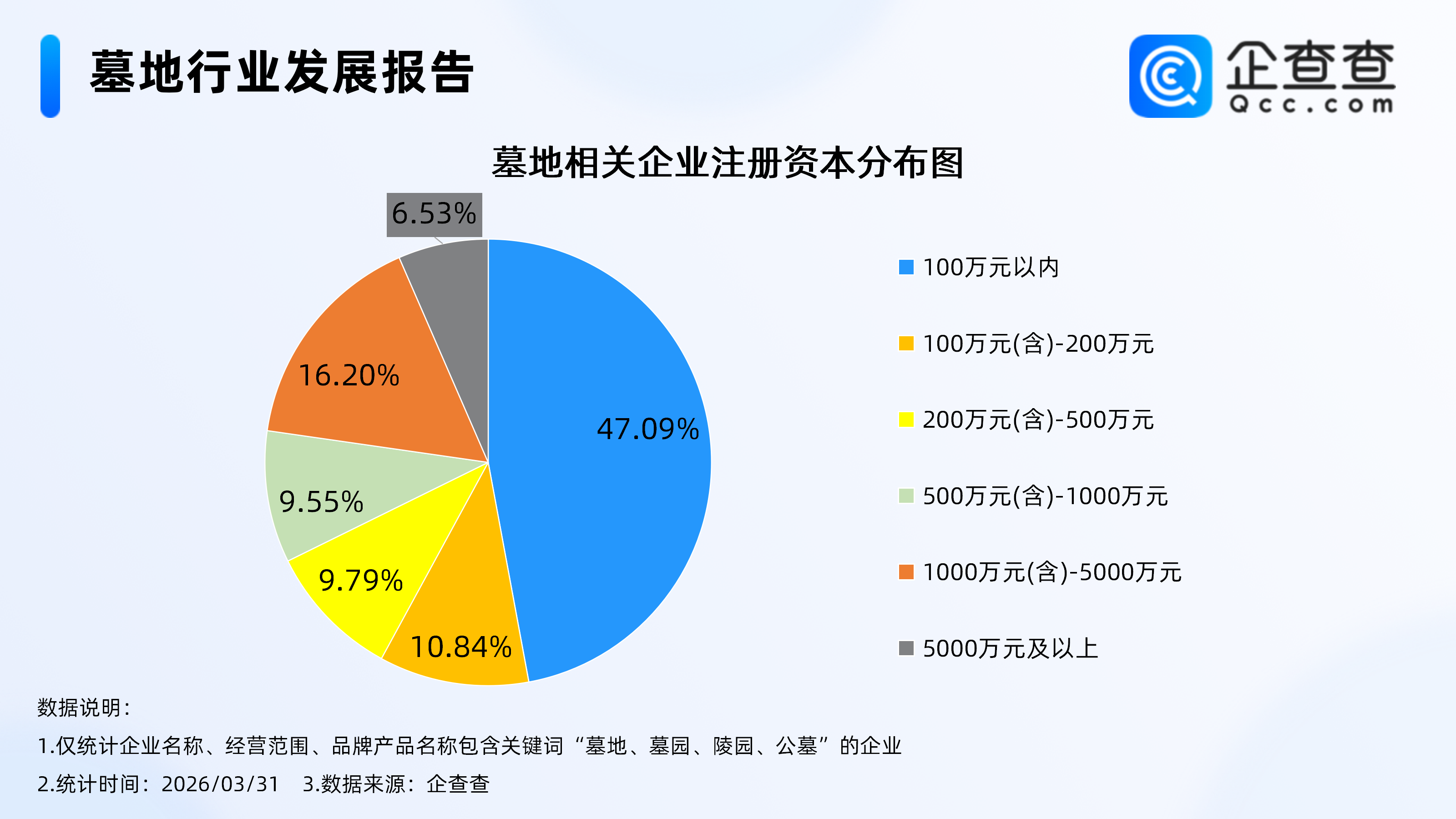 企查查数据显示,从注册资本来看,墓地相关企业分布在注册资本100万元以内区间的最多,占比47.09%。其次,分布注册资本在1000万元(含)-5000万元、100万元(含)-200万元的企业分别占比16.20%、10.84%。