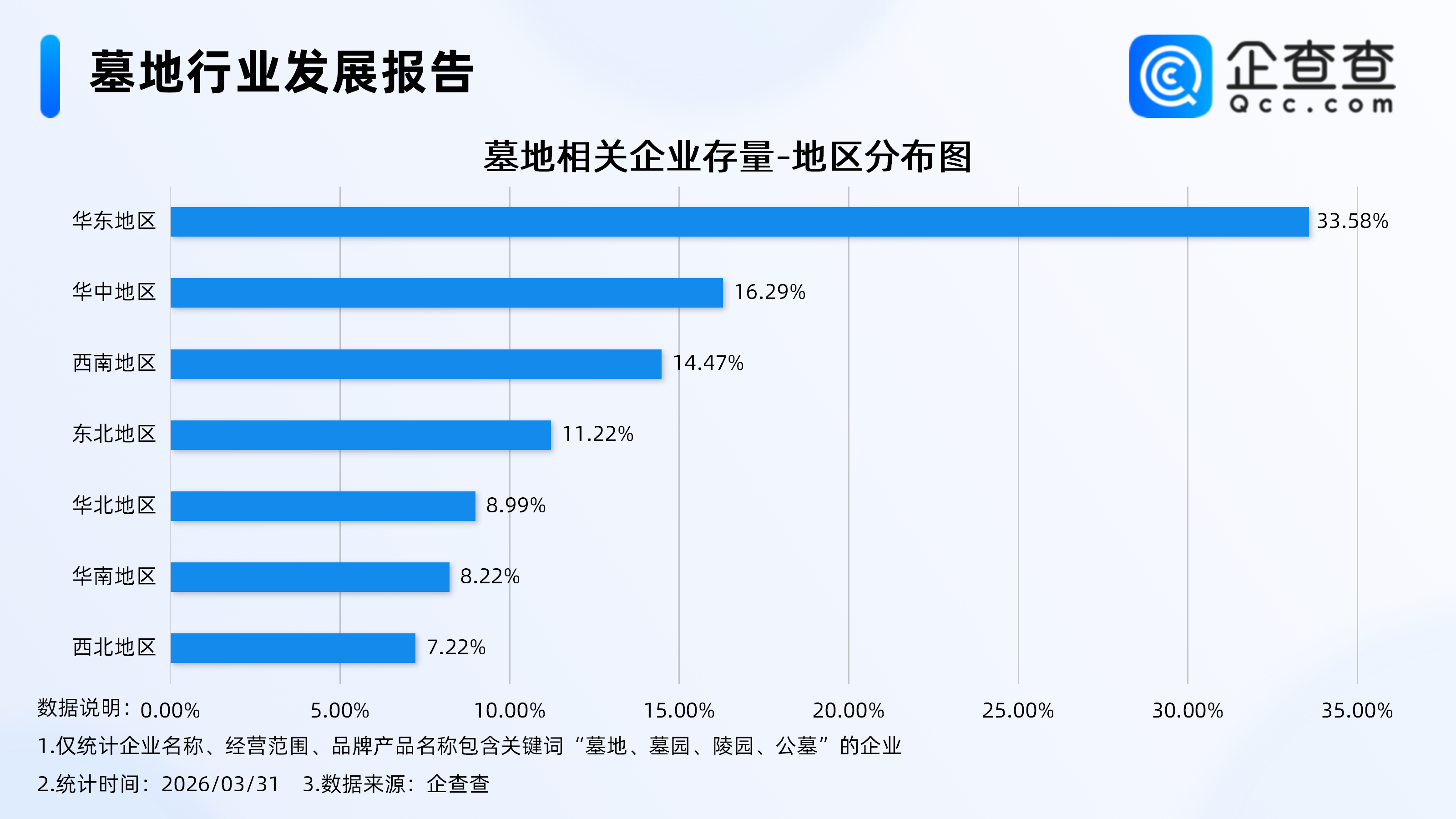 企查查数据显示,从地区分布来看,墓地相关企业多分布在华东地区,占比33.58%。其次,分布在华中地区、西南地区、东北地区的相关企业分别占比16.29%、14.47%、11.22%。其余地区存量占比均不足10%。