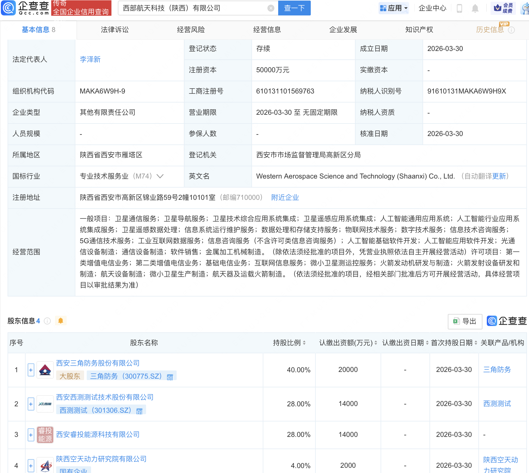 企查查APP显示,近日,西部航天科技(陕西)有限公司成立,注册资本5亿元,经营范围包含:火箭发动机研发与制造;火箭发射设备研发和制造;航天设备制造;微小卫星生产制造等。企查查股权穿透显示,该公司由三角防务(300775)、西测测试(301306)、陕西空天动力研究院有限公司等共同持股。