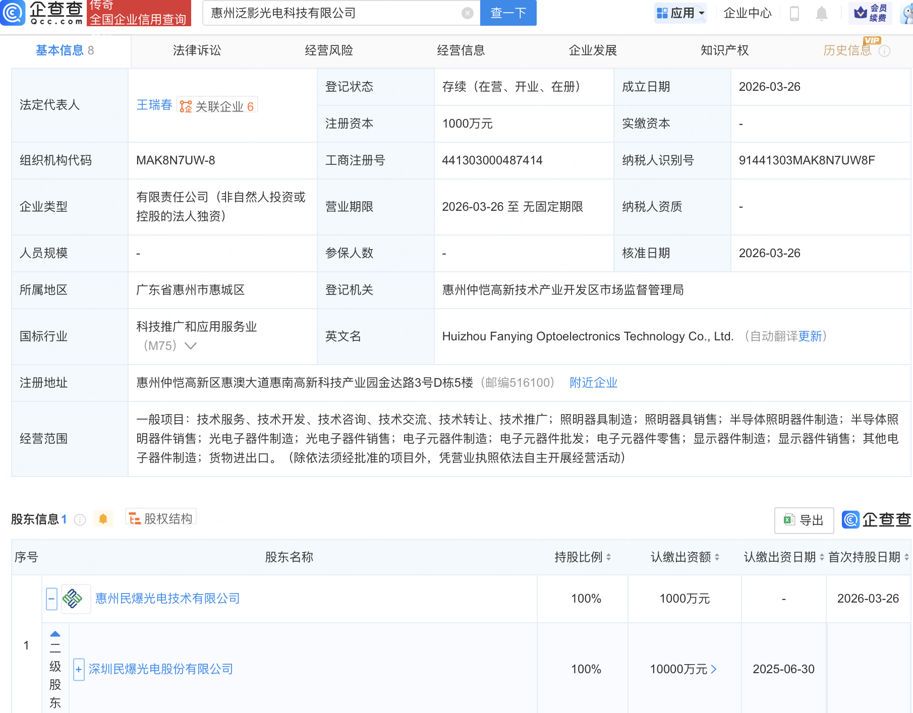 企查查APP显示,近日,惠州泛影光电科技有限公司成立,注册资本1000万元,经营范围包含:半导体照明器件制造;半导体照明器件销售;光电子器件制造;光电子器件销售等。企查查股权穿透显示,该公司由民爆光电(301362)间接全资持股。