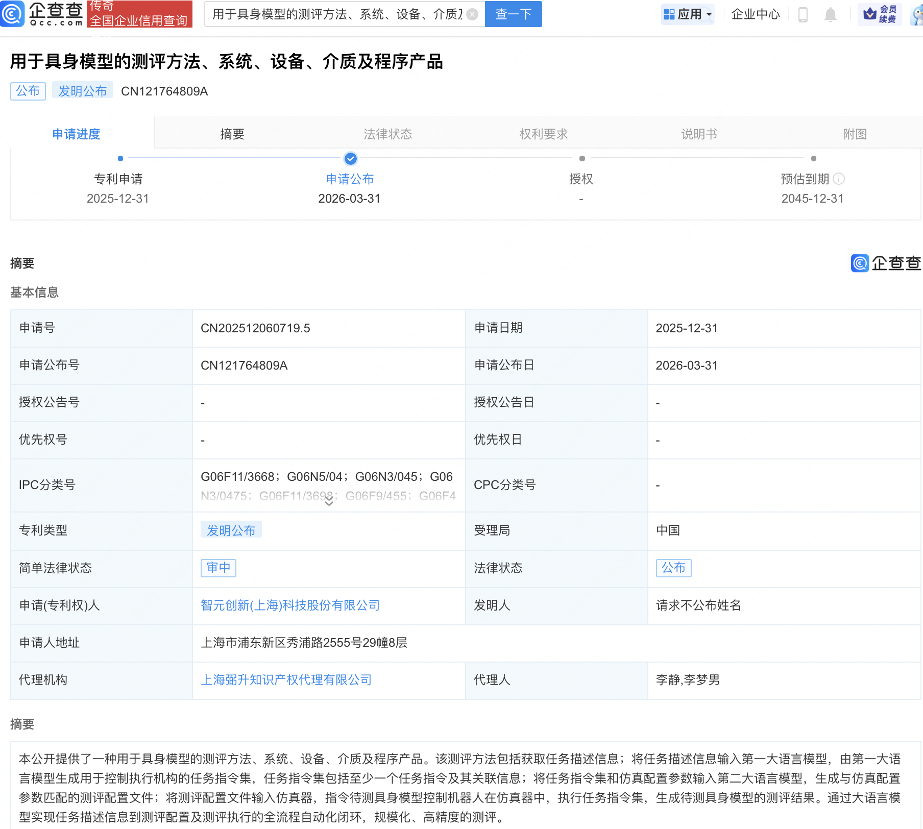 企查查APP显示,近日,智元机器人关联公司智元创新(上海)科技股份有限公司“用于具身模型的测评方法、系统、设备、介质及程序产品”专利公布。企查查专利摘要显示,该测评方法包括获取任务描述信息;将任务描述信息输入第一大语言模型,由第一大语言模型生成用于控制执行机构的任务指令集,任务指令集包括至少一个任务指令及其关联信息;将任务指令集和仿真配置参数输入第二大语言模型,生成与仿真配置参数匹配的测评配置文件;将测评配置文件输入仿真器,指令待测具身模型控制机器人在仿真器中,执行任务指令集,生成待测具身模型的测评结果。通过大语言模型实现任务描述信息到测评配置及测评执行的全流程自动化闭环,规模化、高精度的测评。