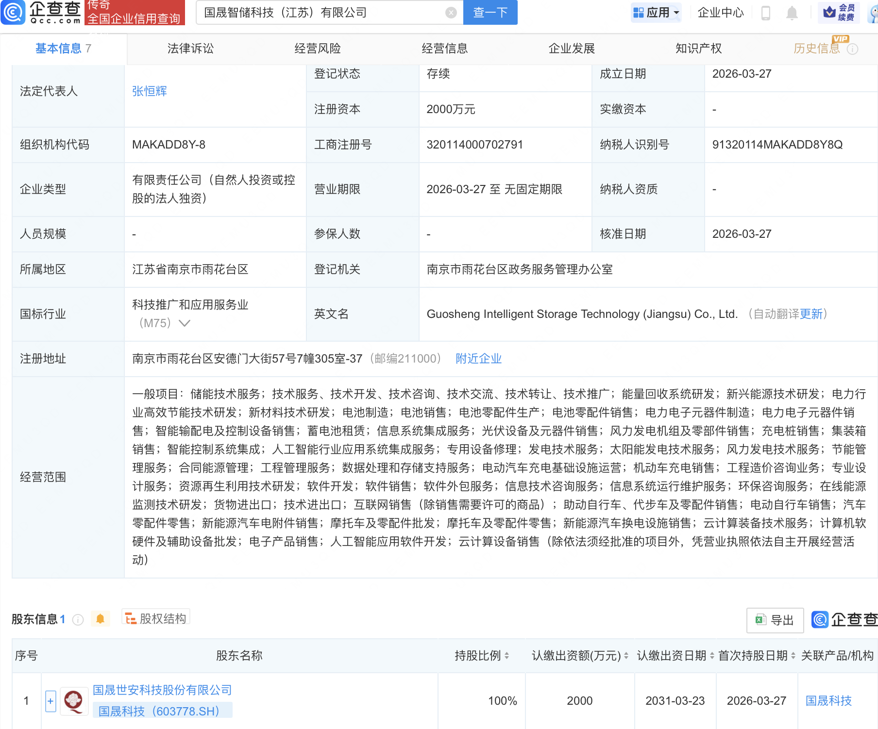 企查查APP显示,近日,国晟智储科技(江苏)有限公司成立,注册资本2000万元,经营范围包含:人工智能行业应用系统集成服务;电子产品销售;人工智能应用软件开发;云计算设备销售等。企查查股权穿透显示,该公司由国晟科技(603778)全资持股。