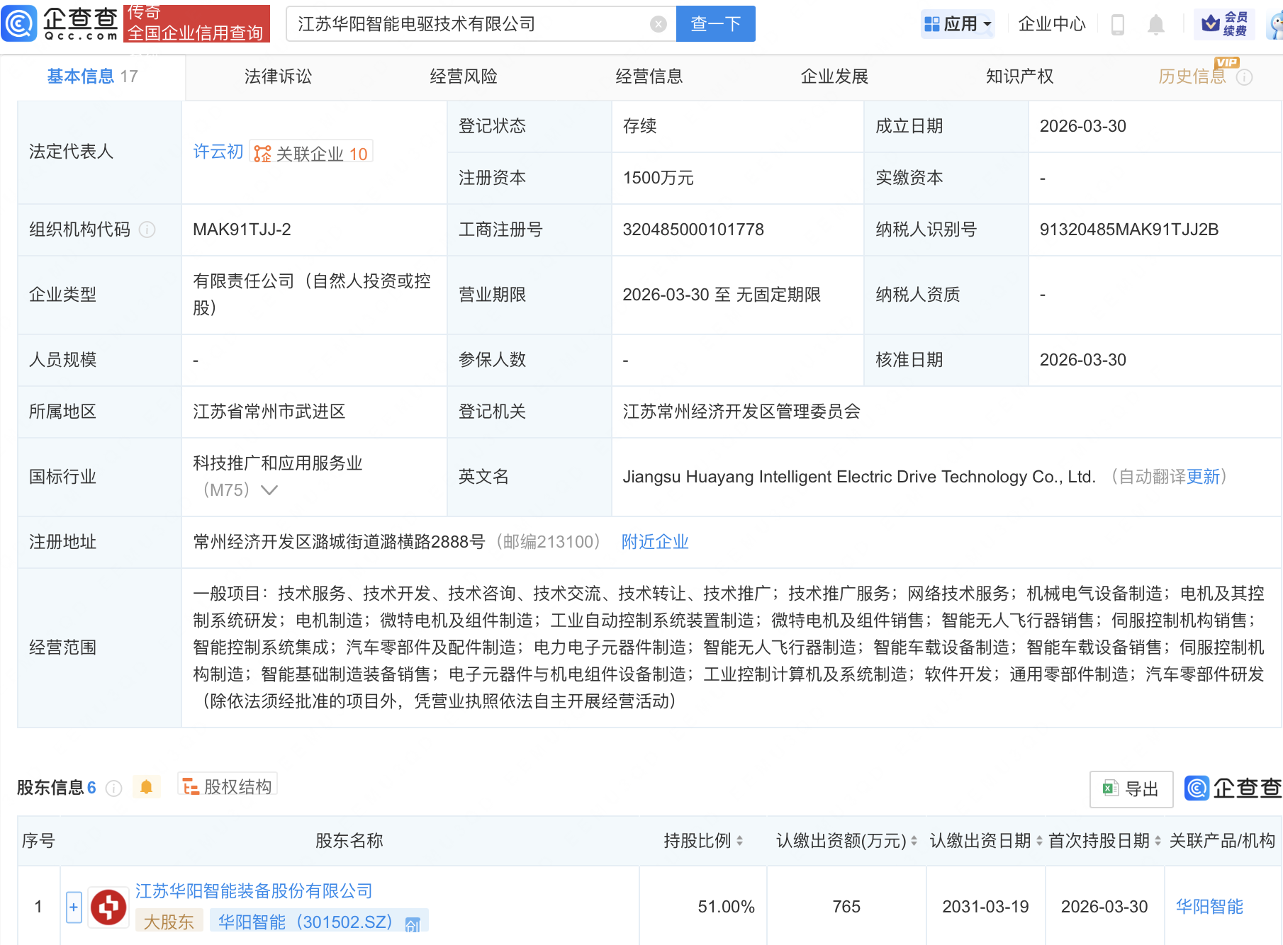 企查查APP显示,近日,江苏华阳智能电驱技术有限公司成立,注册资本1500万元,经营范围包含:智能无人飞行器销售;电力电子元器件制造;智能无人飞行器制造;智能车载设备制造等。企查查股权穿透显示,该公司由华阳智能(301502)等共同持股。