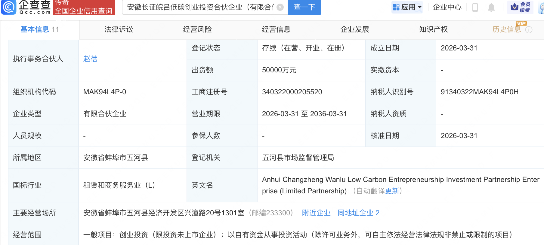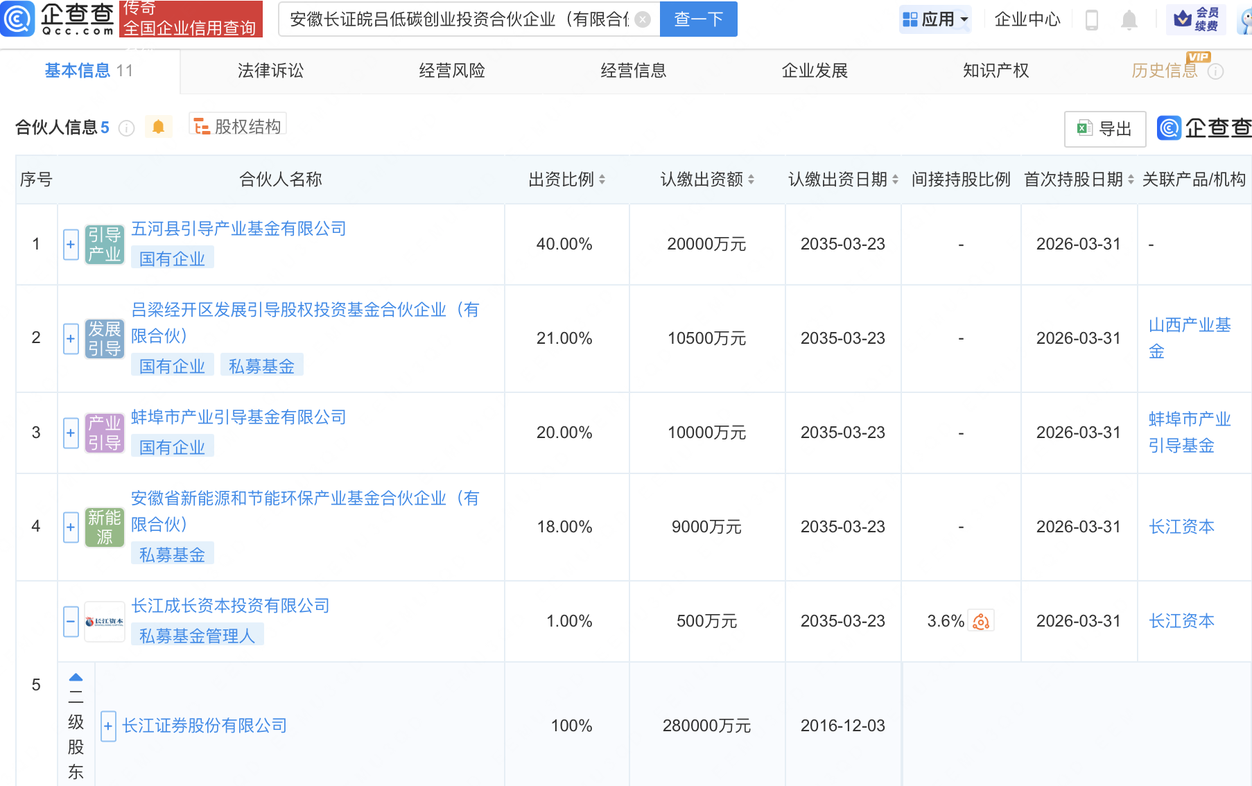 企查查APP显示,近日,安徽长证皖吕低碳创业投资合伙企业(有限合伙)成立,出资额5亿元,经营范围包含:创业投资(限投资未上市企业);以自有资金从事投资活动。企查查股权穿透显示,该企业由长江证券(000783)全资子公司长江成长资本投资有限公司、安徽省新能源和节能环保产业基金合伙企业(有限合伙)等共同出资。