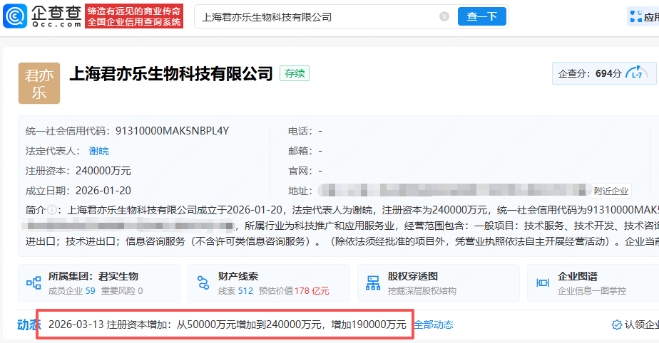 企查查APP显示,近日,上海君亦乐生物科技有限公司发生工商变更,注册资本从5亿元增加到24亿元,增加19亿元。企查查显示,该公司成立于2026年1月,法定代表人为谢皖,由君实生物(688180)全资持股。