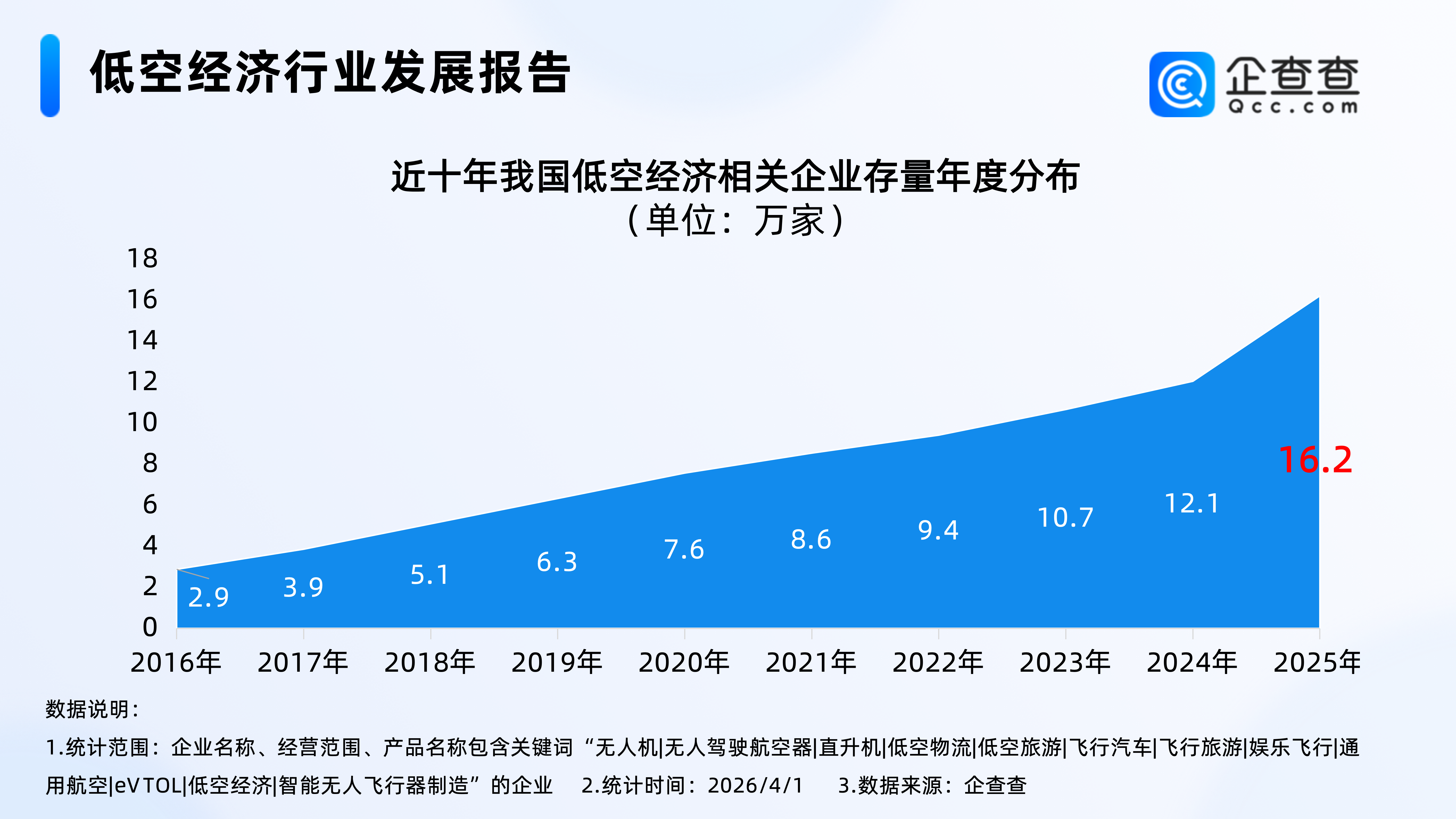 企查查数据显示,近十年,我国低空经济相关企业存量逐年增加,2023年相关企业存量正式突破10万家,达10.7万家;2025年我国低空经济相关企业存量增速加快,年底在业存续16.2万家低空经济相关企业。截至2026年4月1日,我国现存17.0万家低空经济相关企业。