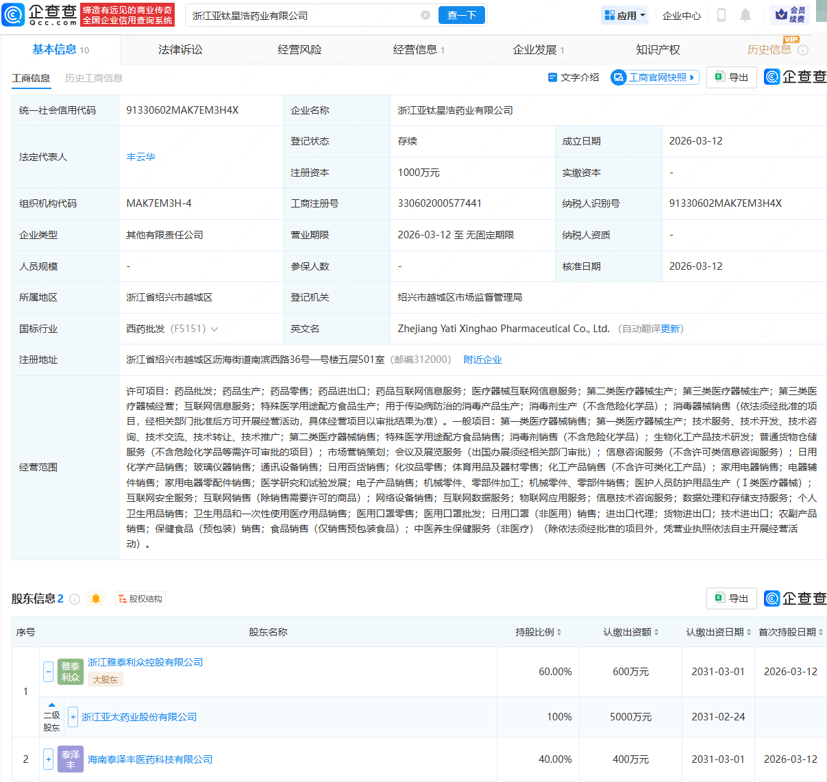 企查查APP显示,近日,浙江亚钛星浩药业有限公司成立,法定代表人为丰云华,注册资本为1000万元,经营范围包含:药品批发;药品生产;药品零售;药品进出口;药品互联网信息服务;第二类医疗器械生产等。企查查股权穿透显示,该公司由亚太药业(002370)全资子公司浙江雅泰利众控股有限公司、海南泰泽丰医药科技有限公司共同持股。