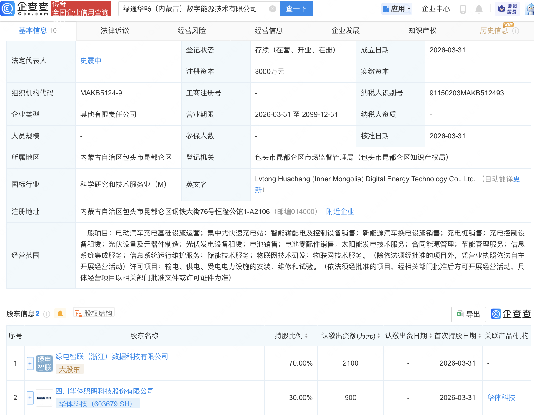 企查查APP显示,近日,绿通华畅(内蒙古)数字能源技术有限公司成立,注册资本3000万元,经营范围包含:电动汽车充电基础设施运营;集中式快速充电站;智能输配电及控制设备销售;新能源汽车换电设施销售等。企查查股权穿透显示,该公司由华体科技(603679)等共同持股。