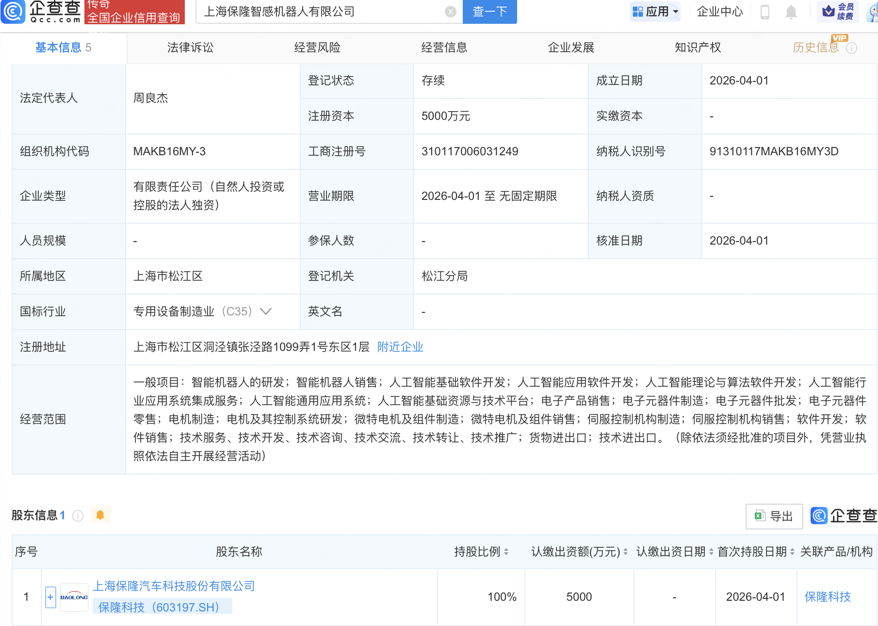 企查查APP显示,近日,上海保隆智感机器人有限公司成立,注册资本5000万元,经营范围包含:智能机器人的研发;智能机器人销售;人工智能基础软件开发;人工智能应用软件开发等。企查查股权穿透显示,该公司由保隆科技(603197)全资持股。