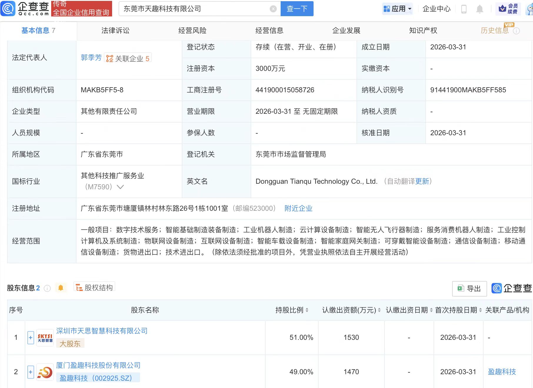 企查查APP显示,近日,东莞市天趣科技有限公司成立,注册资本3000万元,经营范围包含:云计算设备制造;智能无人飞行器制造;服务消费机器人制造;工业控制计算机及系统制造;物联网设备制造等。企查查股权穿透显示,该公司由盈趣科技(002925)等共同持股。