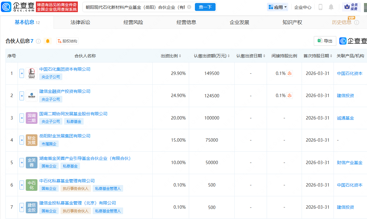 企查查APP显示,近日,朝阳现代石化新材料产业基金(岳阳)合伙企业(有限合伙)成立,出资额50亿元,经营范围包含:创业投资(限投资未上市企业);以私募基金从事股权投资、投资管理、资产管理等活动等。企查查股权穿透显示,该合伙企业由中国石化集团资本有限公司、建信金融资产投资有限公司等共同持股。