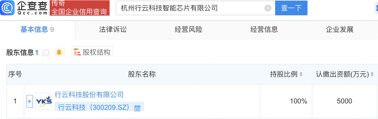 企查查APP显示,近日,杭州行云科技智能芯片有限公司成立,注册资本5000万元,经营范围包含:集成电路设计;集成电路芯片设计及服务;人工智能硬件销售;人工智能行业应用系统集成服务等。企查查股权穿透显示,该公司由行云科技(300209)全资持股。