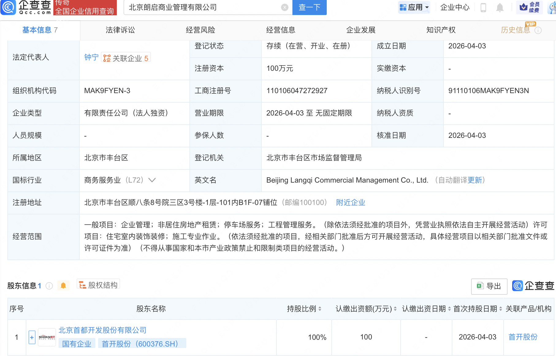 企查查APP显示,近日,北京卓第商业管理有限公司、北京朗启商业管理有限公司成立,经营范围均包含:企业管理;非居住房地产租赁;停车场服务;工程管理服务等。企查查股权穿透显示,二者皆由首开股份(600376)全资持股。