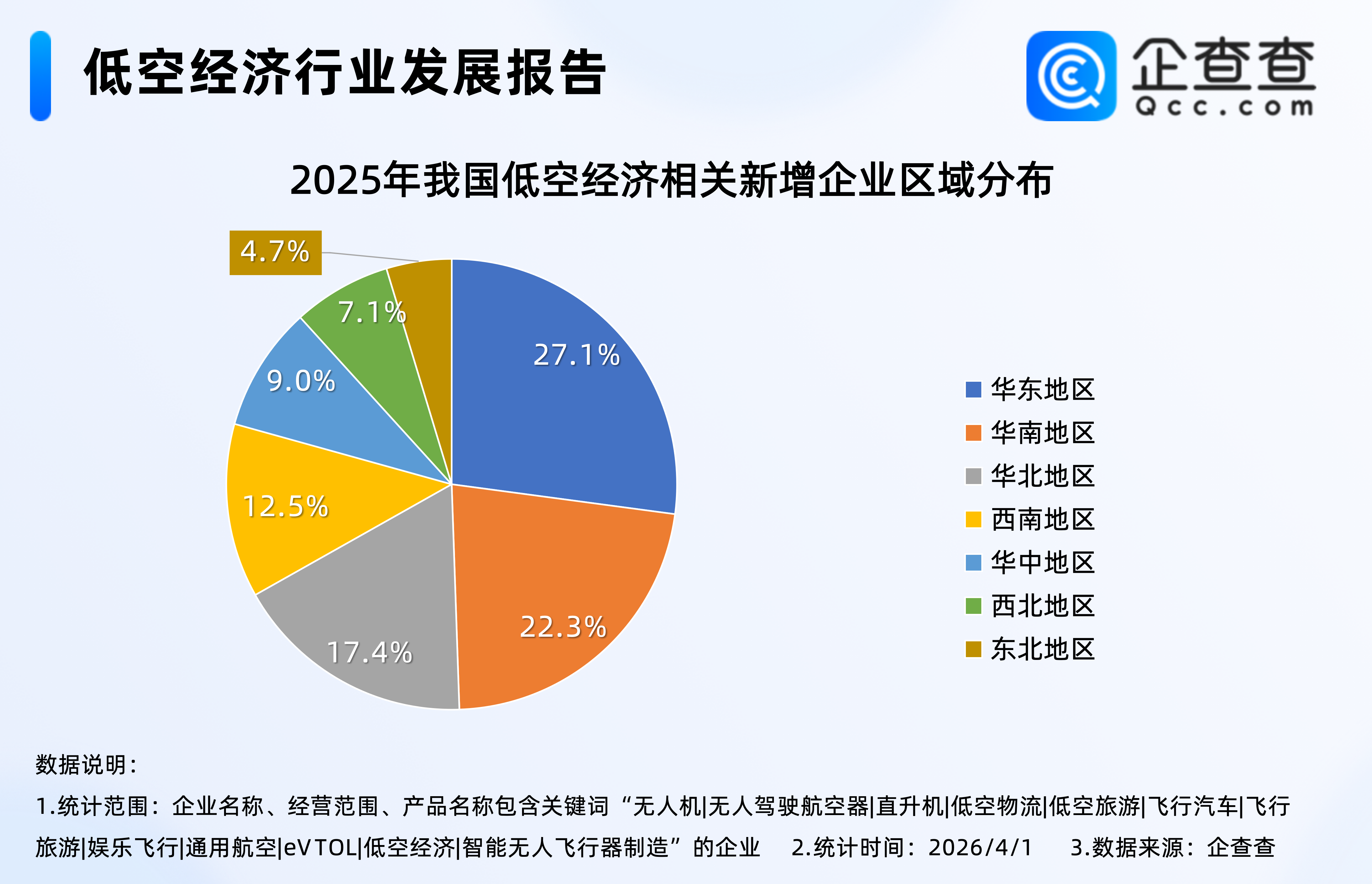 企查查数据显示,2025年新注册的近5万家低空经济相关企业中,位于华东地区的相关企业最多,占比27.1%,其次是华南地区,占比22.3%,西北、东北地区相对较少,分占7.1%、4.7%。