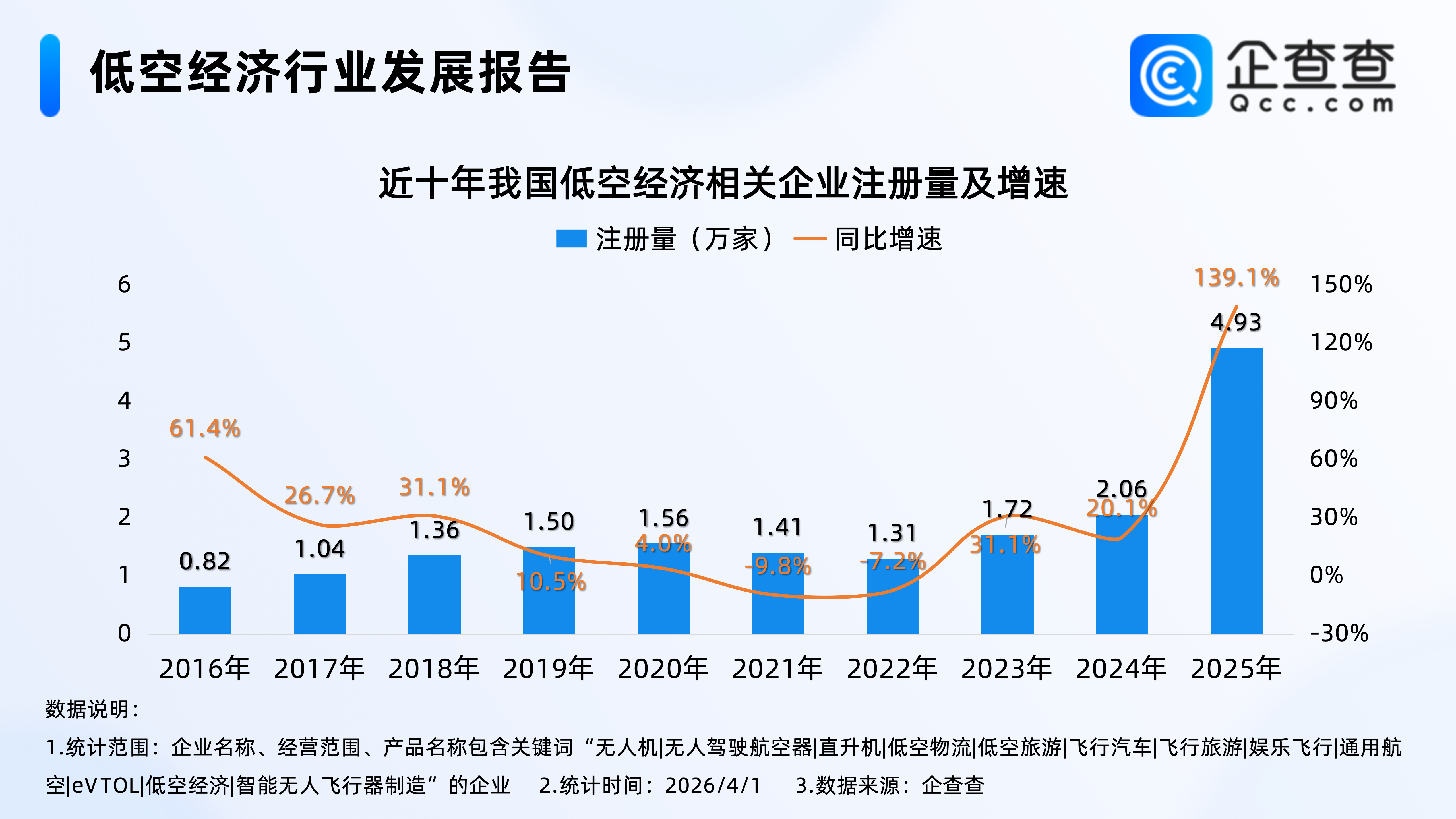 企查查数据显示,近十年,我国低空经济相关企业注册量基本逐年增加,2025年全年,我国低空经济相关企业注册量同比激增139.1%至4.93万家,创注册量及增速双新高。截至4月1日,2026年我国已注册9193家低空经济相关企业。
