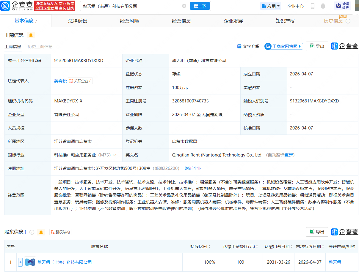企查查APP显示,近日,擎天租(南通)科技有限公司成立,法定代表人为姜青松,经营范围包含:机械设备租赁;人工智能应用软件开发;智能机器人的研发;人工智能基础软件开发;智能机器人销售等。企查查股权穿透显示,该公司由擎天租(上海)科技有限公司全资持股。