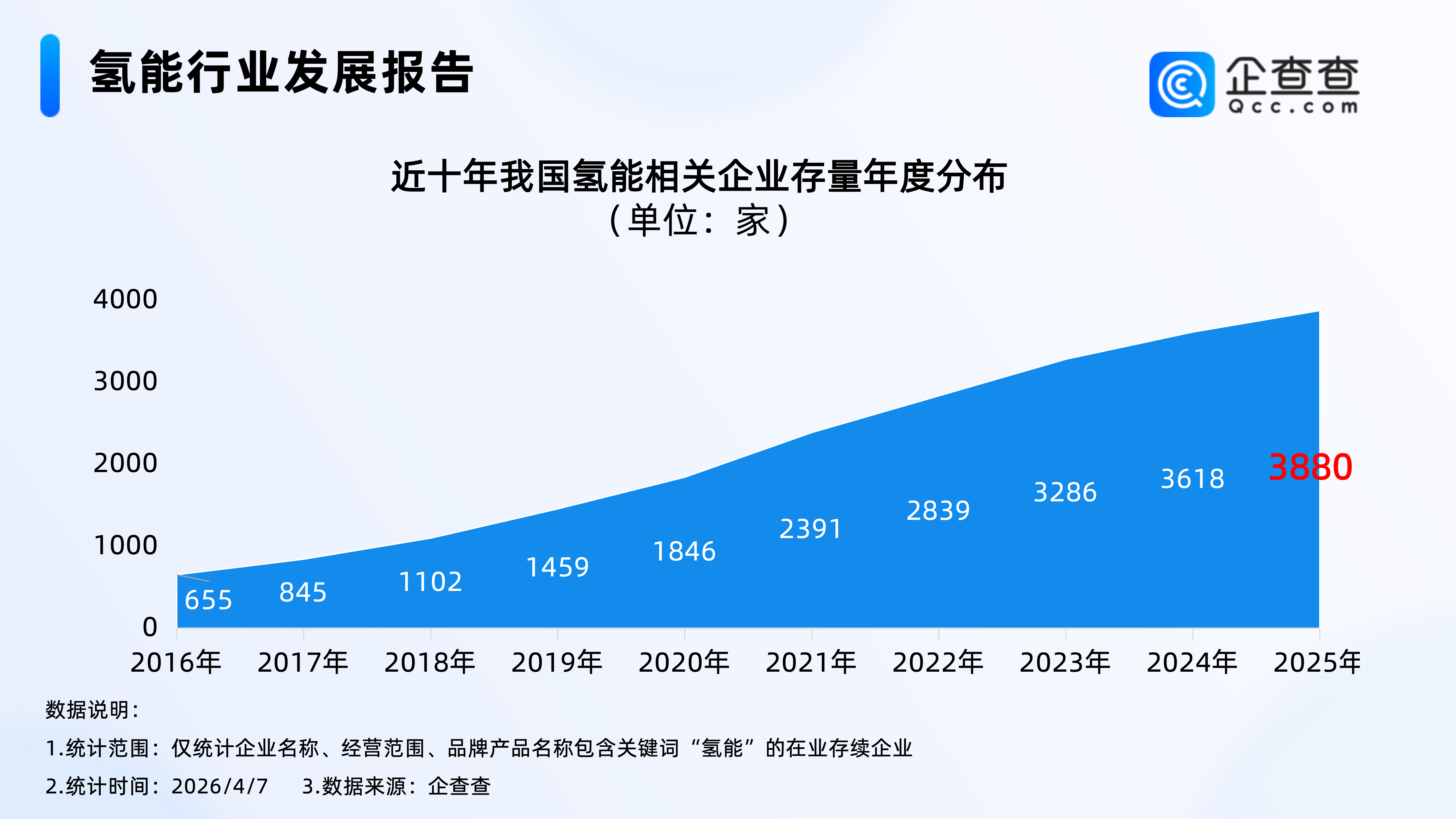 企查查数据显示,近十年,我国氢能相关企业存量逐年稳定增加,截至2025年年底,我国在业存续3880家氢能相关企业。截至2026年4月7日,我国现存3920家氢能相关企业。