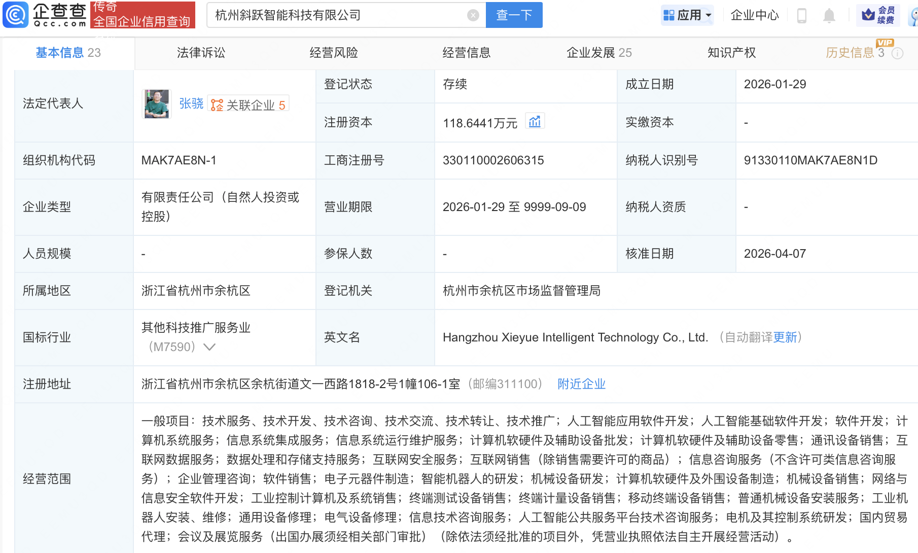 企查查APP显示,近日,杭州斜跃智能科技有限公司发生工商变更,新增理想汽车旗下重庆车之辕创业投资有限公司等为股东,同时注册资本增至约118.6万人民币。企查查信息显示,该公司成立于2026年1月,经营范围含人工智能应用软件开发,人工智能基础软件开发,工业机器人安装、维修等。公开信息显示,斜跃智能是一家消费级具身智能公司,聚焦家庭场景,做面向C端用户的消费级具身智能产品。