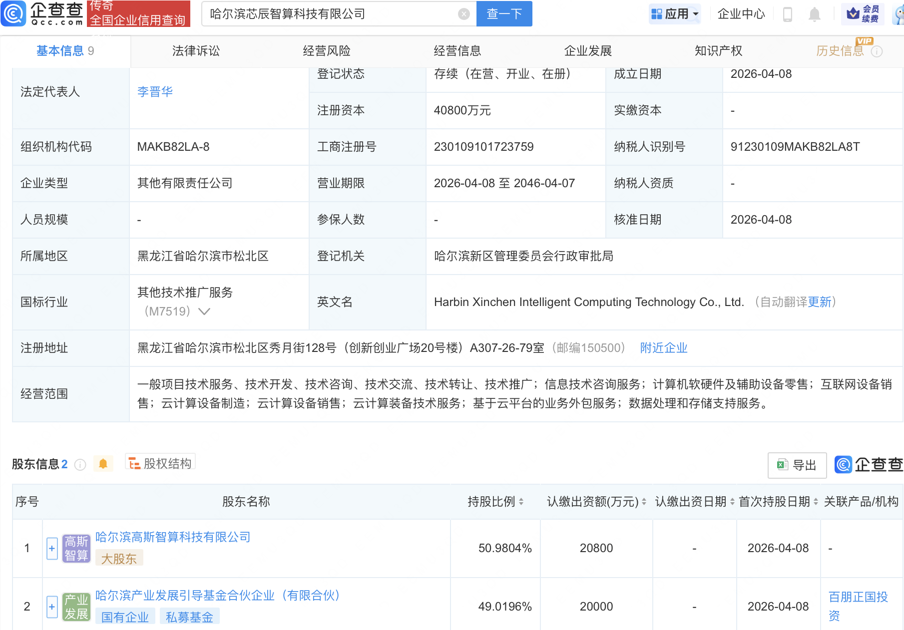 企查查APP显示,近日,哈尔滨芯辰智算科技有限公司成立,注册资本4.08亿元,经营范围包含:互联网设备销售;云计算设备制造;云计算设备销售;云计算装备技术服务;基于云平台的业务外包服务等。企查查股权穿透显示,该公司由哈尔滨高斯智算科技有限公司、哈尔滨产业发展引导基金合伙企业(有限合伙)共同出资。
