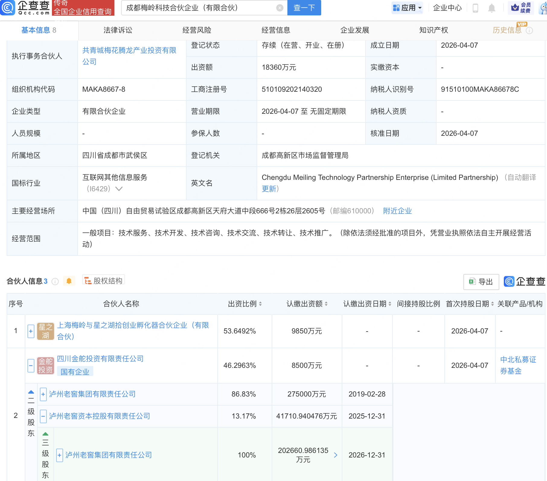 企查查APP显示,近日,成都梅岭科技合伙企业(有限合伙)成立,出资额1.84亿元,经营范围包含:技术服务、技术开发、技术咨询、技术交流、技术转让、技术推广。企查查股权穿透显示,该企业由泸州老窖集团有限责任公司旗下四川金舵投资有限责任公司等共同出资。