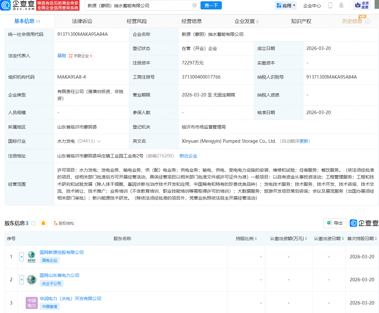 企查查APP显示,近日,新源(蒙阴)抽水蓄能有限公司成立,法定代表人为聂刚,注册资本为7.23亿元,经营范围包含:水力发电;发电业务、输电业务、供(配)电业务;供电业务;输电、供电、受电电力设施的安装、维修和试验等。企查查股权穿透显示,该公司由国家电网旗下国网新源控股有限公司、国网山东省电力公司等共同持股。