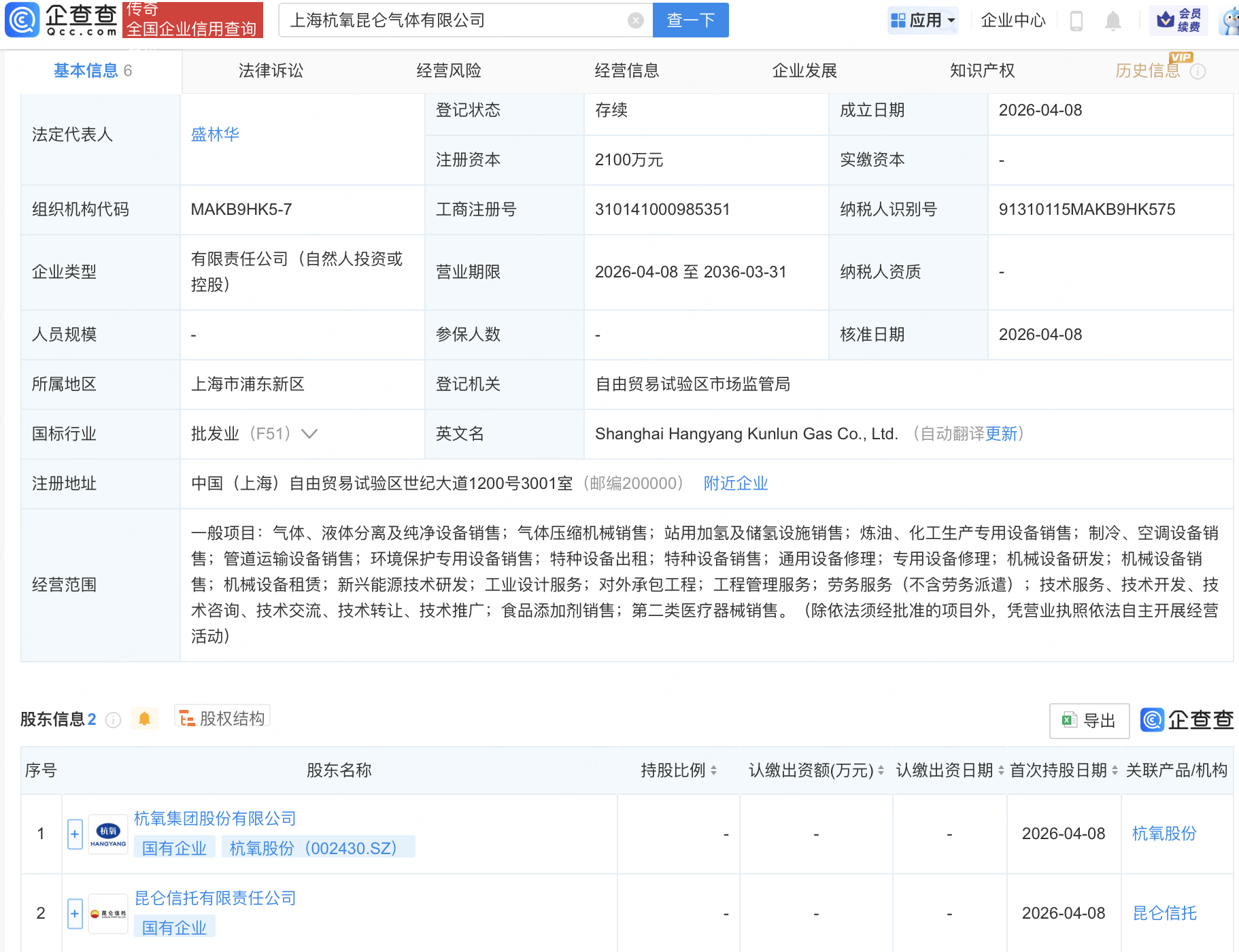企查查APP显示,近日,上海杭氧昆仑气体有限公司成立,注册资本2100万元,经营范围包含:气体、液体分离及纯净设备销售;气体压缩机械销售;站用加氢及储氢设施销售;炼油、化工生产专用设备销售等。企查查股权穿透显示,该公司由杭氧股份(002430)、昆仑信托有限责任公司共同持股。