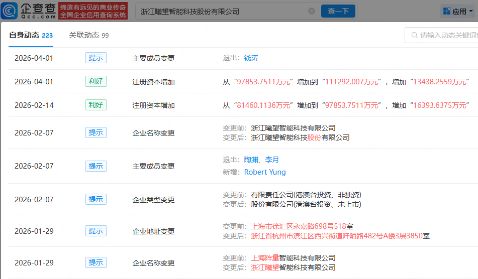 企查查APP显示,近日,GPU芯片公司曦望(Sunrise)关联公司浙江曦望智能科技股份有限公司发生工商变更,注册资本从9.79亿元增加至约11.13亿元,此前该公司已进行过一次增资,且公司类型变更为股份有限公司(港澳台投资、未上市)。