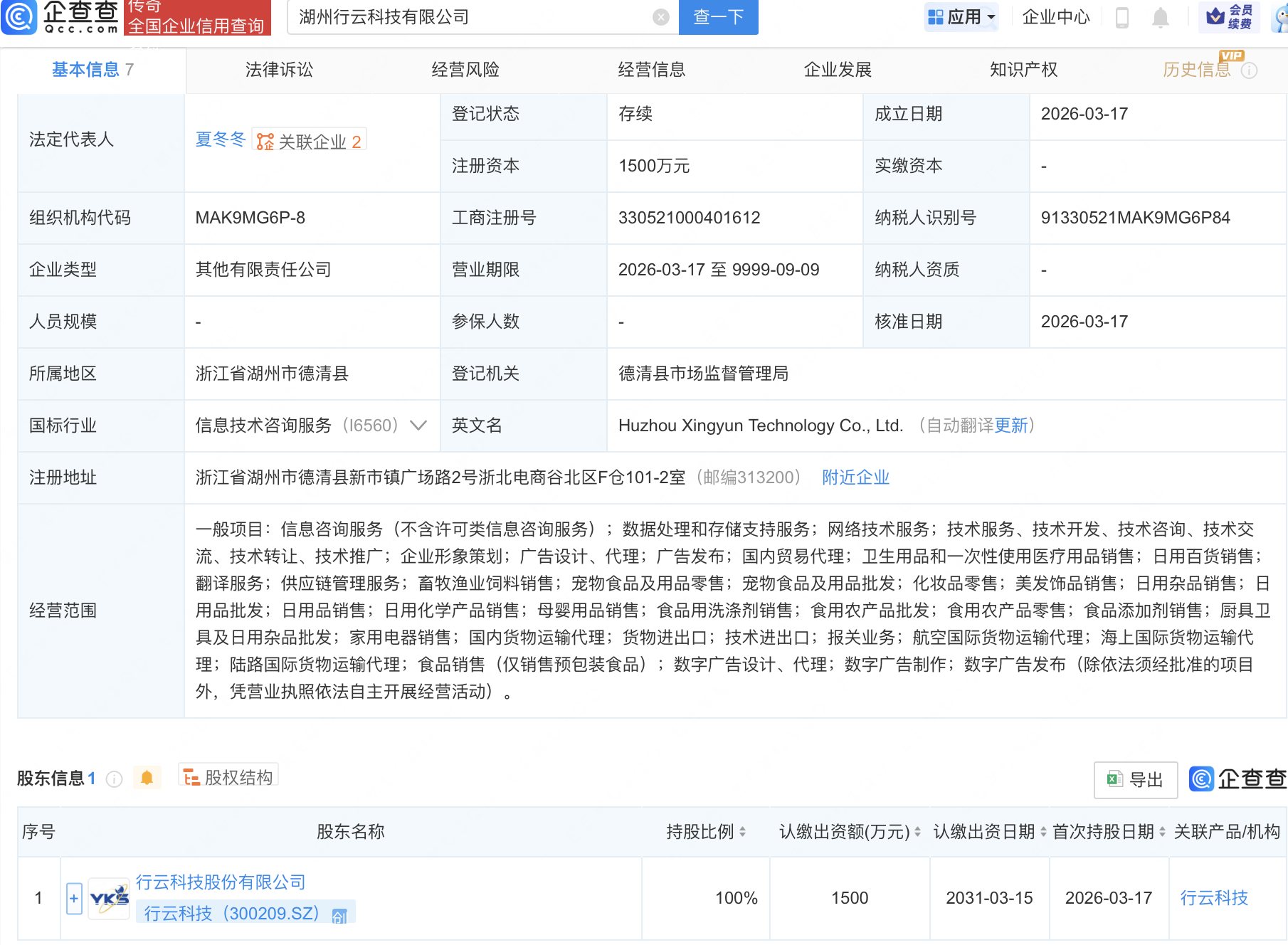 企查查APP显示,近日,岳阳行云科技有限公司、湖州行云科技有限公司成立,注册资本均为1500万元,经营范围均包含:航空国际货物运输代理;海上国际货物运输代理;陆路国际货物运输代理等。企查查股权穿透显示,二者皆由行云科技(300209)全资持股。