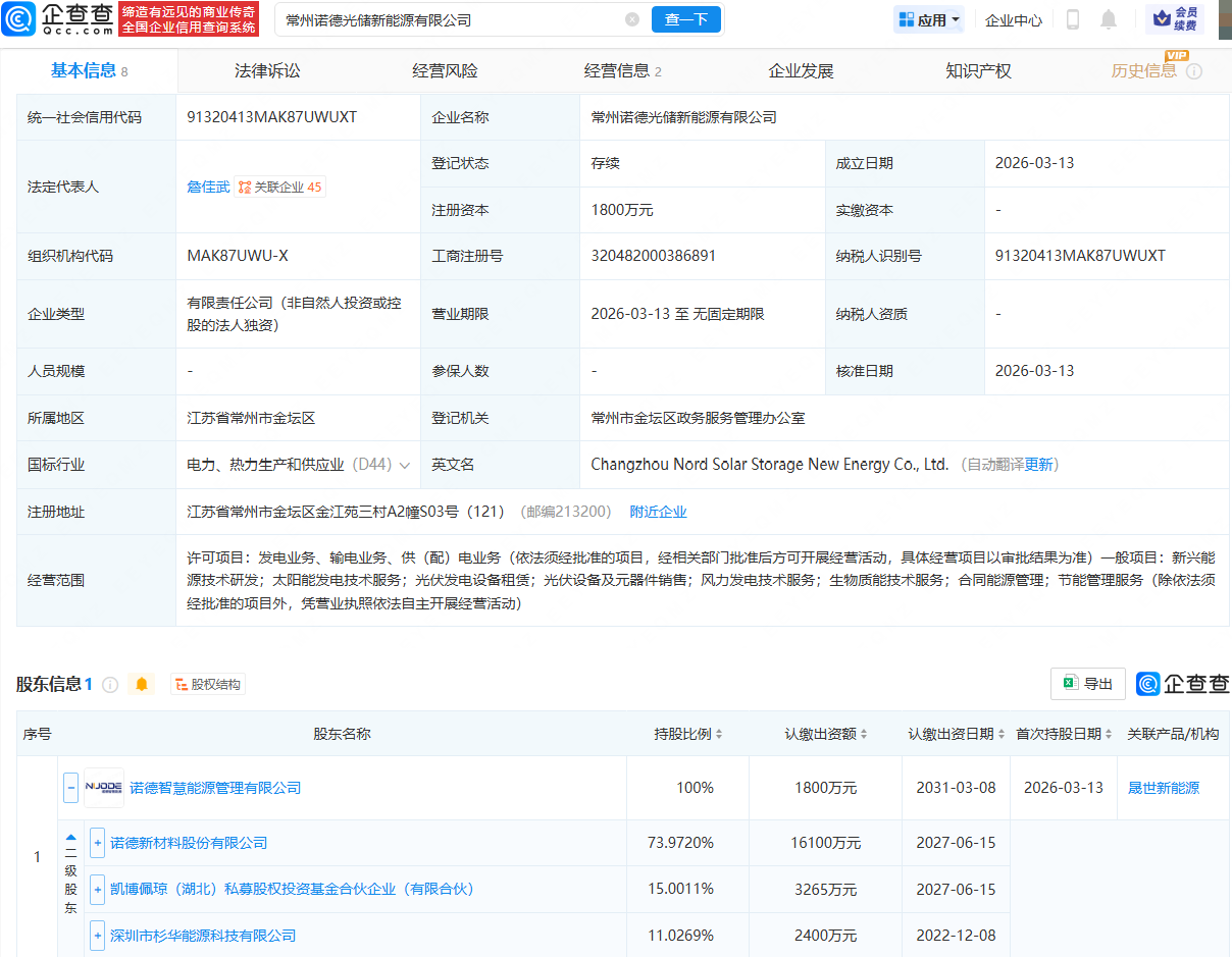 企查查APP显示,近日,常州诺德光储新能源有限公司成立,法定代表人为詹佳武,注册资本为1800万元,经营范围包含:发电业务、输电业务、供(配)电业务;太阳能发电技术服务;光伏发电设备租赁等。企查查股权穿透显示,该公司由诺德股份(600110)旗下诺德智慧能源管理有限公司全资持股。