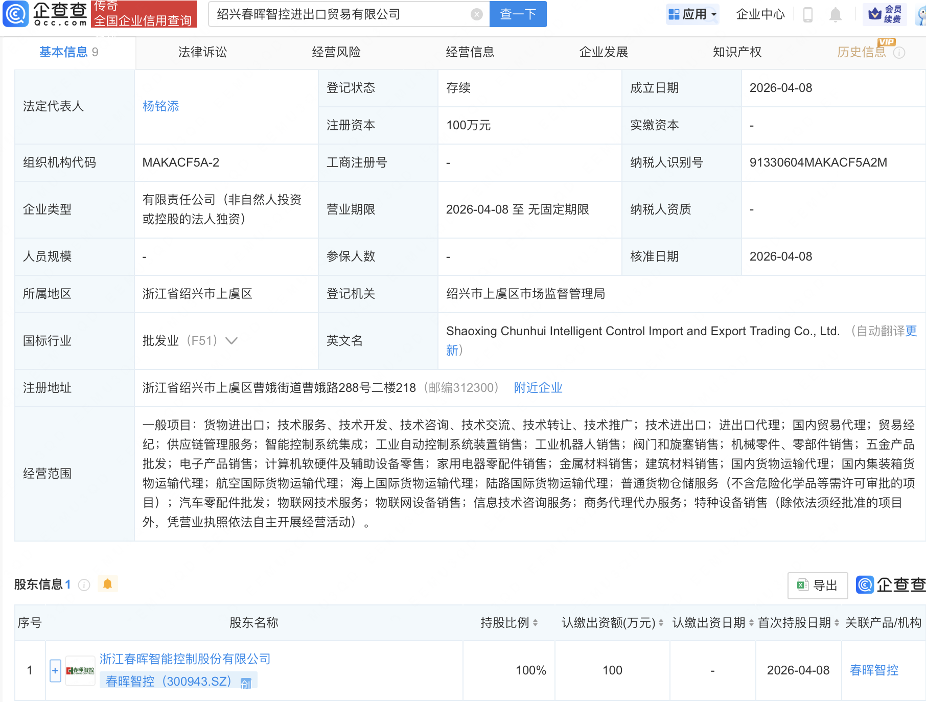企查查APP显示,近日,绍兴春晖智控进出口贸易有限公司成立,经营范围包含:供应链管理服务;智能控制系统集成;工业自动控制系统装置销售;工业机器人销售等。企查查股权穿透显示,该公司由春晖智控(300943)全资持股。