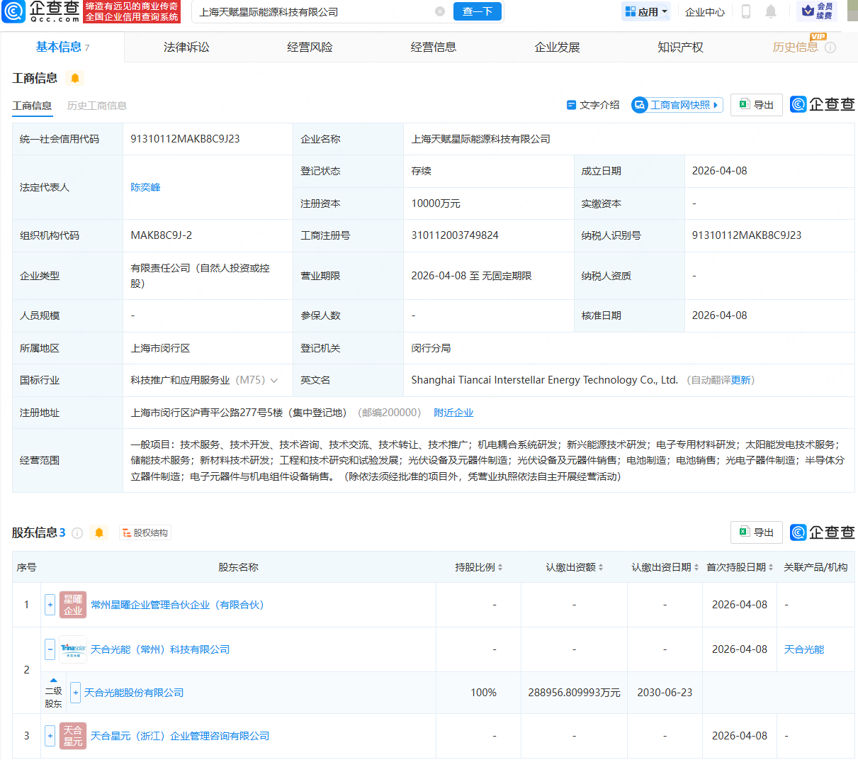 企查查APP显示,近日,上海天赋星际能源科技有限公司成立,法定代表人为陈奕峰,注册资本为1亿元,经营范围包含:新兴能源技术研发;电子专用材料研发;太阳能发电技术服务;储能技术服务;新材料技术研发等。企查查股权穿透显示,该公司由天合光能(688599)旗下天合光能(常州)科技有限公司、天合星元(浙江)企业管理咨询有限公司、常州星曜企业管理合伙企业(有限合伙)共同持股。