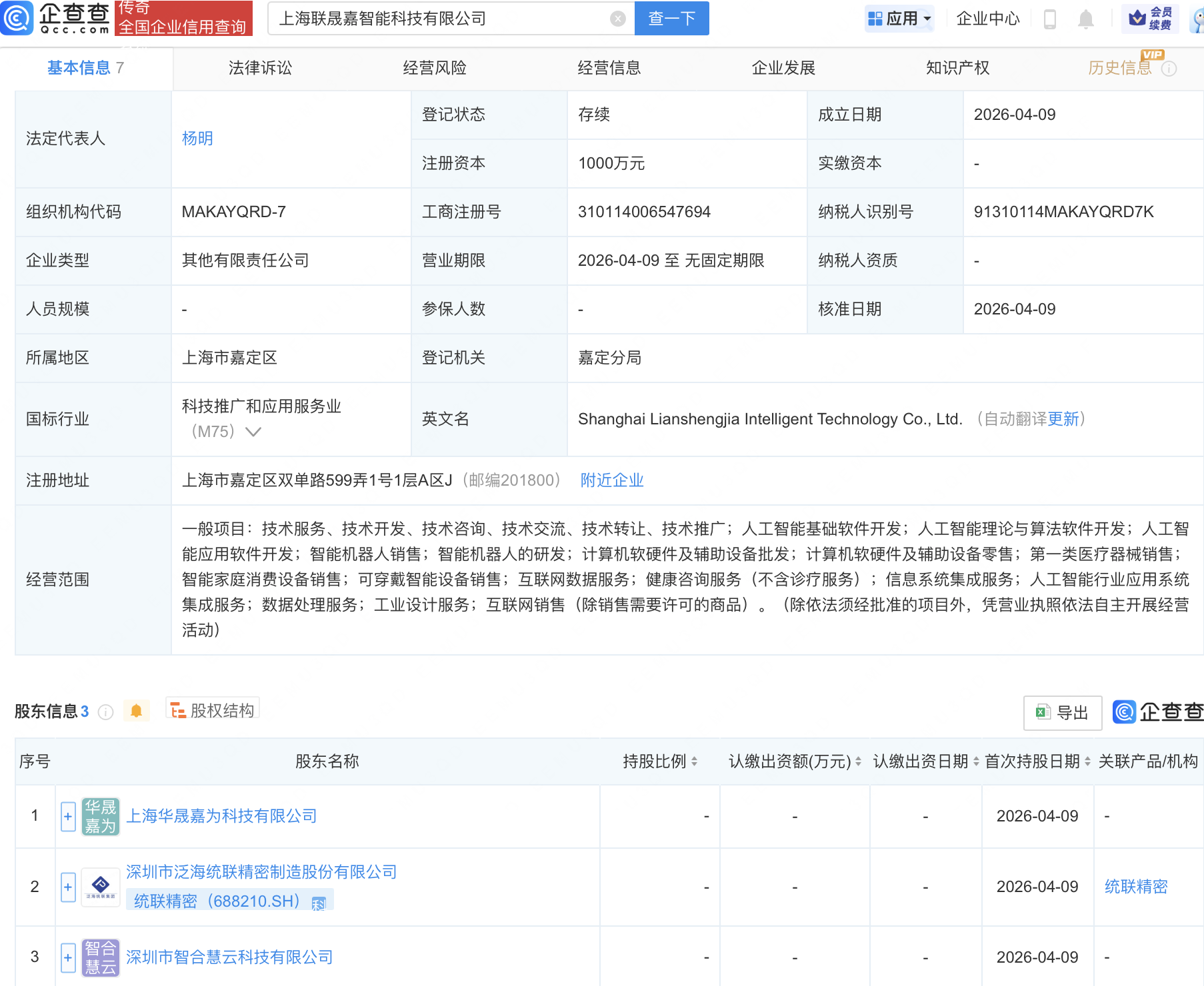 企查查APP显示,近日,上海联晟嘉智能科技有限公司成立,注册资本1000万元,经营范围包含:人工智能基础软件开发;人工智能理论与算法软件开发;人工智能应用软件开发;智能机器人销售;智能机器人的研发等。企查查股权穿透显示,该公司由统联精密(688210)等共同持股。