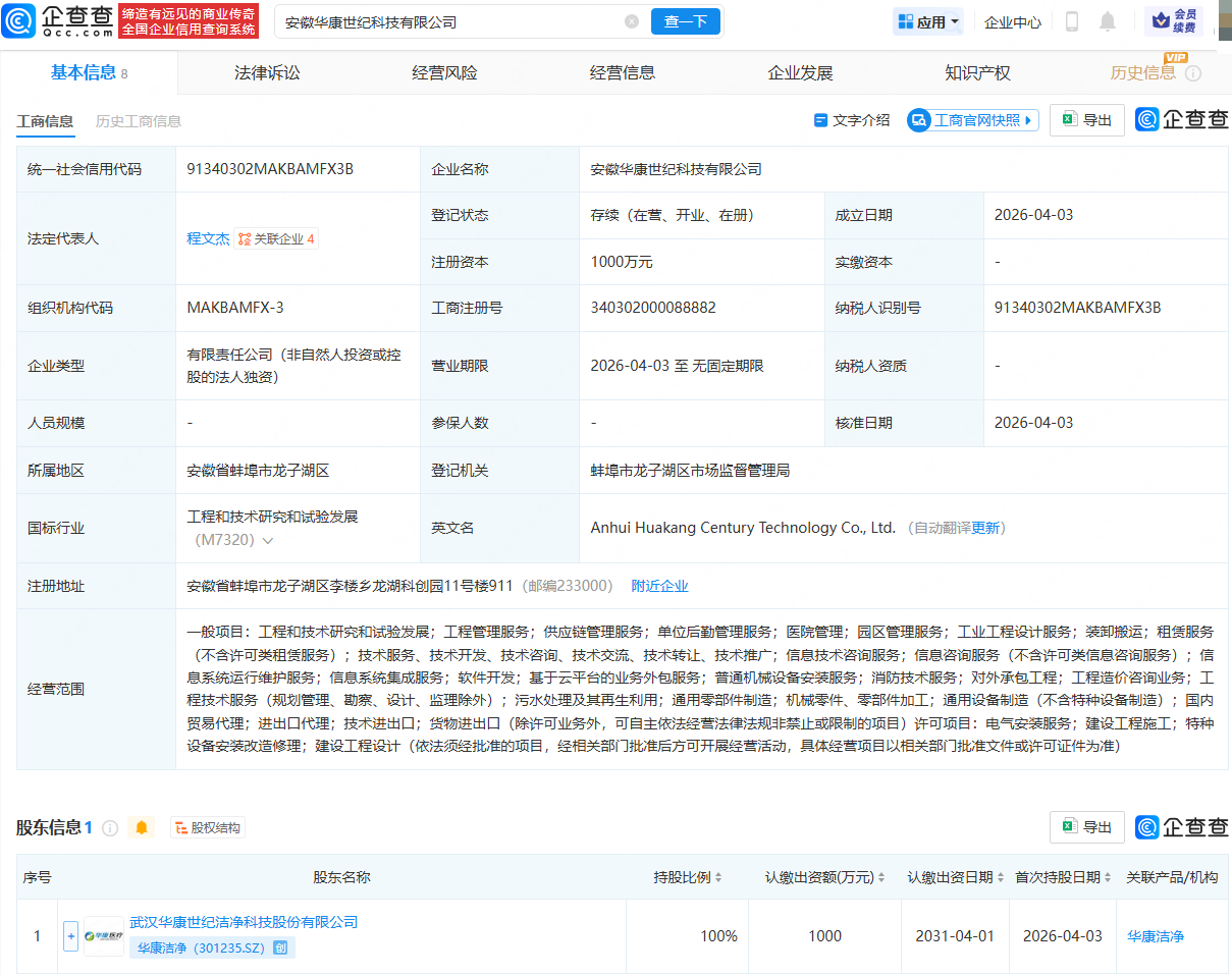 企查查APP显示,近日,安徽华康世纪科技有限公司成立,法定代表人为程文杰,注册资本为1000万元,经营范围包含:工程和技术研究和试验发展;工程管理服务;供应链管理服务;通用零部件制造;电气安装服务等。企查查股权穿透显示,该公司由华康洁净(301235)全资持股。