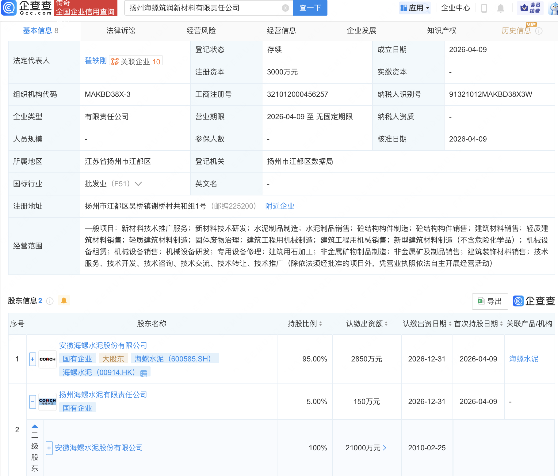 企查查APP显示,近日,扬州海螺筑润新材料有限责任公司成立,注册资本3000万元,经营范围包含:新材料技术推广服务;新材料技术研发;水泥制品制造;水泥制品销售等。企查查股权穿透显示,该公司由海螺水泥(600585)间接全资持股。