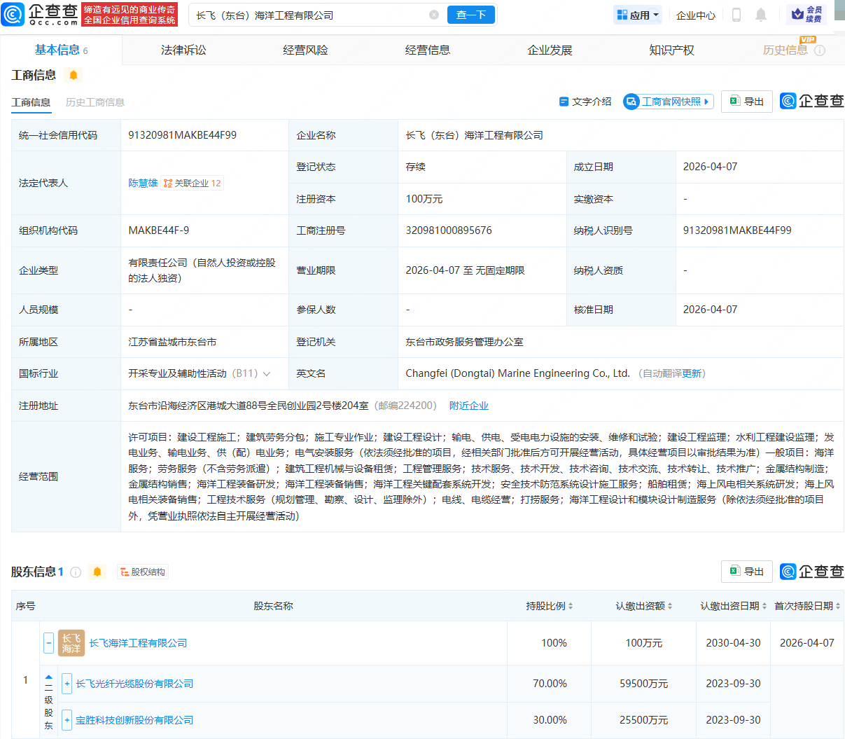 企查查APP显示,近日,长飞(东台)海洋工程有限公司成立,法定代表人为陈慧雄,经营范围包含:发电业务、输电业务、供(配)电业务;电气安装服务;海洋服务;海上风电相关系统研发等。企查查股权穿透显示,该公司由长飞海洋工程有限公司全资持股,后者由长飞光纤(601869)、宝胜股份(600973)共同持股。