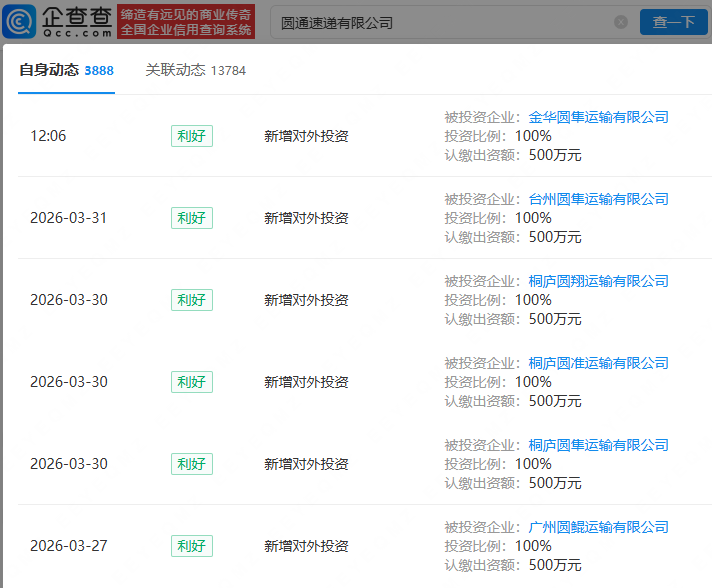 企查查APP显示,近日,圆通速递有限公司对外投资成立多家运输公司,包括金华圆隼运输有限公司、台州圆隼运输有限公司、桐庐圆翔运输有限公司等,企查查股权穿透显示,新成立公司均由圆通速递(600233)间接全资持股。